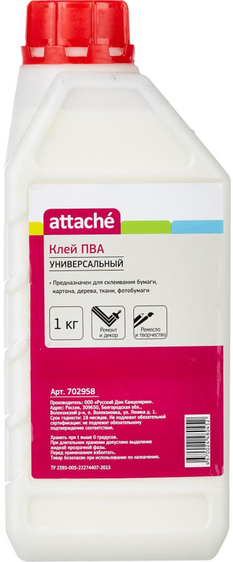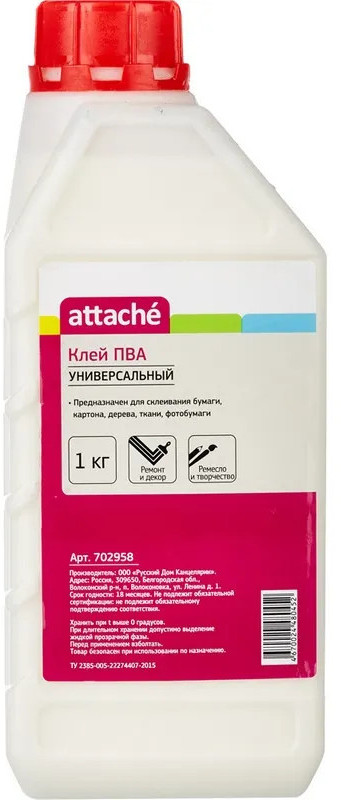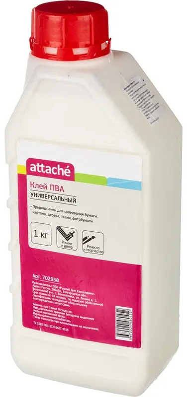 💳 Оплатить за товар можно при получении 🇰🇿 Есть бесплатная доставка по Казахстану от 1 дня 🎁 Копите бонусы с каждой покупки Клей ПВА Attache предназначен для склеивания бумаги, картона, дерева, ткани, кожи, фотобумаги. Отлично подходит для хобби и творчества для взрослых и детей. Клей поставляется в удобной пластиковой бутылке. Объем клея 1000 г (989.7 мл). Клей ПВА при минусовых температурах замерзает, т. к. сделан на основе воды, но при оттаивании не теряет своих свойств. Его можно заморозить и размораживать 5 раз, и он не потеряет ни своих свойств, ни товарного вида. Температура воздуха при использовании не ниже 5. Необходимо взболтать перед применением. Большой объем позволит надолго обеспечить сотрудников необходимым товаром, и сэкономить офисный бюджет. |