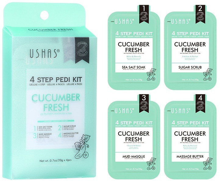 Sea salt soak: Sodium Chloride, Cucumis Sativus (cucumber) Extract, Fragrance, Mentha Arvensis Leaf Extract, Pelargonium Graveolens Flower/Leaf/Stem Extract, Aloe Barbadensis Extract, Chrysanthellum Indicum Extract, Portulaca Oleracea Extract, Sophara Angustifolia Root Extract. May Contain: CI 42090, CI 19140.