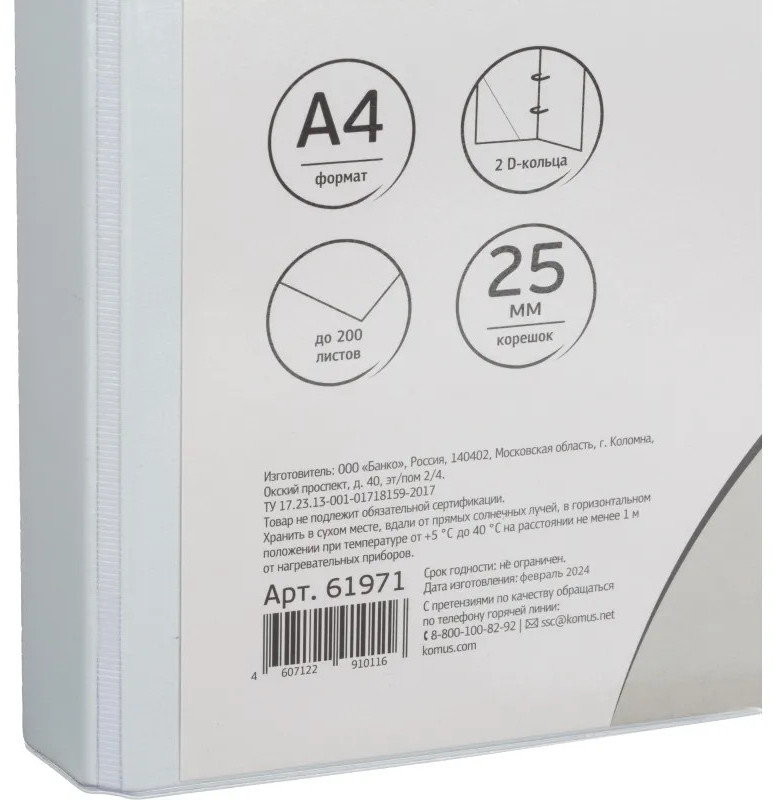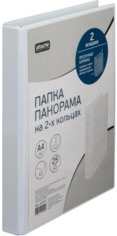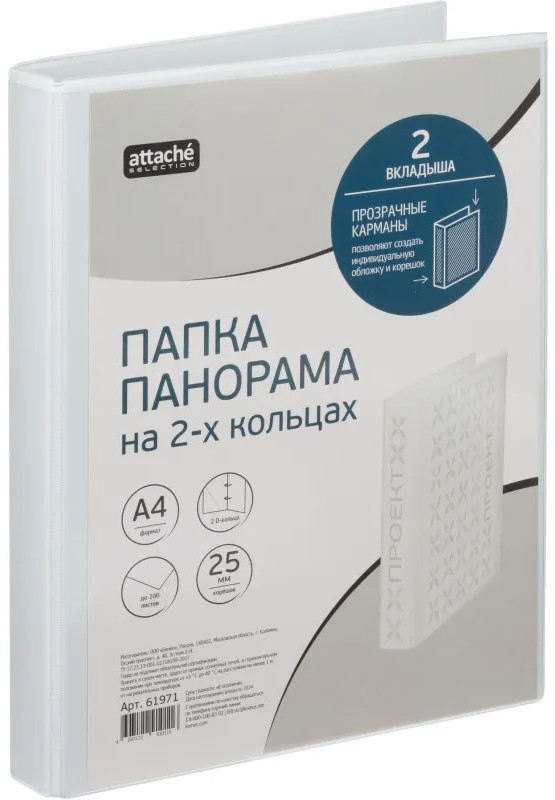 Папка Панорама изготовлена из прочного картона толщиной 1.75 мм, покрытого с двух сторон пленкой ПВХ белого цвета. Формат А4, ориентирован вертикально. Оснащены механизмом на двух D-образных кольцах диаметром 20мм. Вмещают до 200 листов стандартной плотности. Корешок шириной 25 мм имеет прозрачный карман для сменной этикетки. На лицевой и оборотной сторонах папки для презентаций расположены карманы А4 для размещения титульного листа и прочей информации. На внутренней стороне обложки - карман для документов.С начала 2024 года прекращено производство всех товаров ТМ Bantex (Хамелин А/С, Дания). Все артикулы продукции бренда Bantex (после реализации остатков, произведенных до 31.12.2023) будут переведены на продукцию бренда Attache Selection, с сохранением всех потребительских характеристик и свойств товаров. На переходный период допускается поставка данной продукции в двух вариантах дизайна упаковки.Законодательные и технические документы: |
