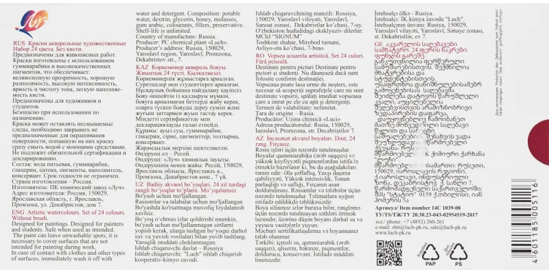 💳 Оплатить за товар можно при получении 🇰🇿 Есть бесплатная доставка по Казахстану от 1 дня 🎁 Копите бонусы с каждой покупки Краски акварельные медовые Луч De Luxe 24 цвета Акварельные медовые краски Луч De Luxe предназначены для художественного творчества и учебной работы. Краски изготовлены на основе натурального растительного клея - гуммиарабика - и насыщены пигментами высокого качества. Акварель отличается прозрачностью, чистотой цвета и интенсивностью тона. Краски легко размываются водой, создавая ровный цветной слой, хорошо смешиваются между собой, не крошатся, не смазываются и быстро сохнут. Подходят для многослойной техники. Безопасны для детей, не содержат токсичных веществ. Набор включает 24 полусухие краски: белила, жёлтая, алая, красная охра, жёлто-зелёная, зелёная, синяя, чёрная, лимонная, оранжевая, розовая, бордо, изумрудно-зелёная, лазурно-голубая, фиолетовая, коричневая, тёмно-жёлтая, охра, жёлто-оранжевая, светло-красная железоокисная, карминовая, фиолетово-розовая, голубая, оригинальная зелёная. Состав: вода питьевая, гуммиарабик, глицерин, патока, пигменты, наполнитель, консервант. Хранить в сухом отапливаемом помещении при температуре не ниже 0C на расстоянии не менее 1 м от приборов отопления. Краски размещены в пластмассовом пенале с прозрачной крышкой и дополнительно упакованы в цветную картонную коробку. Размер упаковки - 220x108x16 мм. Кисточка в комплект не входит. Законодательные и технические документы |
