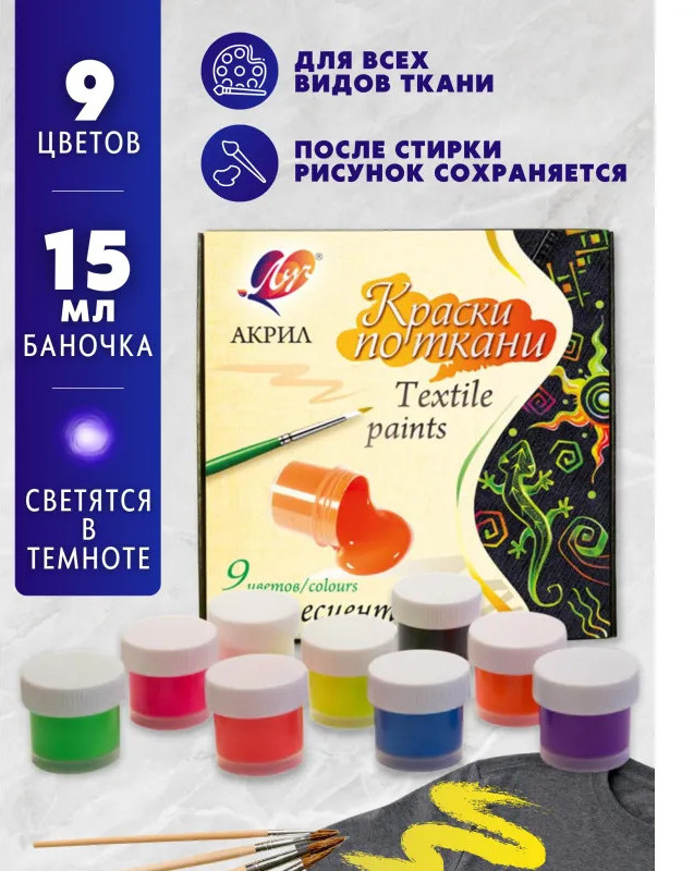 💳 Оплатить за товар можно при получении 🇰🇿 Есть бесплатная доставка по Казахстану 🎁 Копите бонусы с каждой покупки Декоративные краски по ткани для росписи тканей из натуральных и синтетических волокон. Способ применения: 1. Ткань перед нанесением рисунка необходимо выстирать, погладить, натянуть на пяльцы или разложить на ровной поверхности. Под слой ткани, на который будет наноситься рисунок, необходимо положить пленку, для избежания протекания краски. 2. Перед применением краску тщательно перемешать. В случае небольшого загустевания, краску можно развести водой. 3. Нанести краску тонким слоем при помощи кисти и дать рисунку высохнуть в течение суток. 4. Фиксация рисунка: после высыхания краски поместить ткань с рисунком между двумя листами бумаги и прогладить утюгом без пара с изнаночной стороны не менее 5 минут при максимальной температуре, рассчитанной на соответствующий тип ткани. Если рисунок не зафиксировать утюгом, краска состирается при первой же стирке! 5. После фиксации рисунка допускается ручная стирка готового изделия мягкими моющими средствами при температуре 30-40°С. Законодательные и технические документы? в раздел Описание КТ ИМК по артикулам во вложенном файле. |