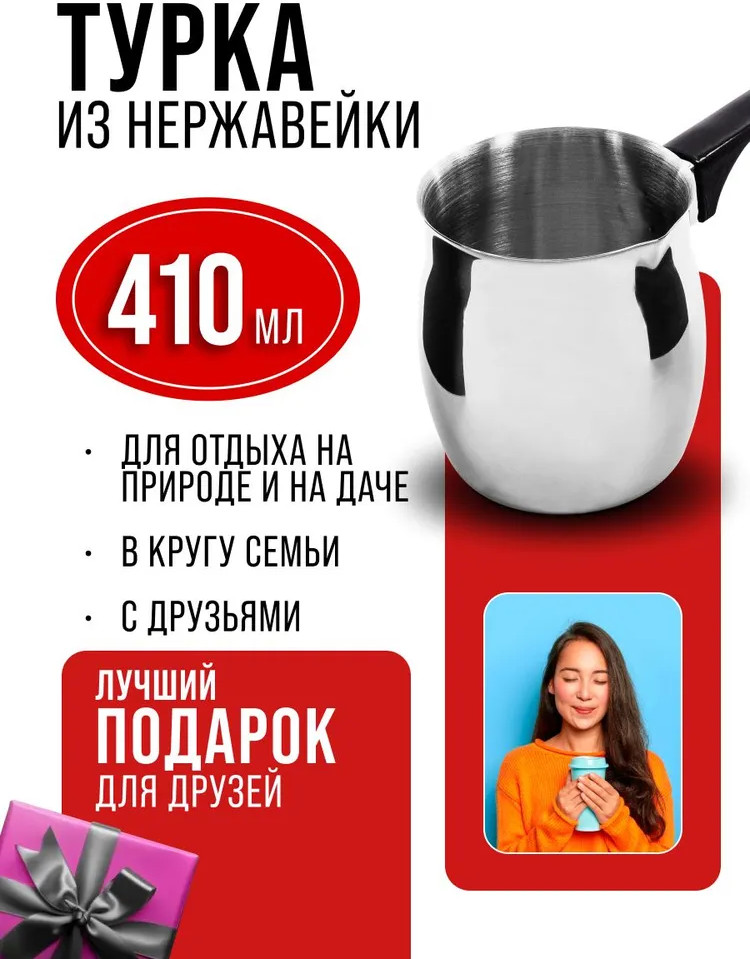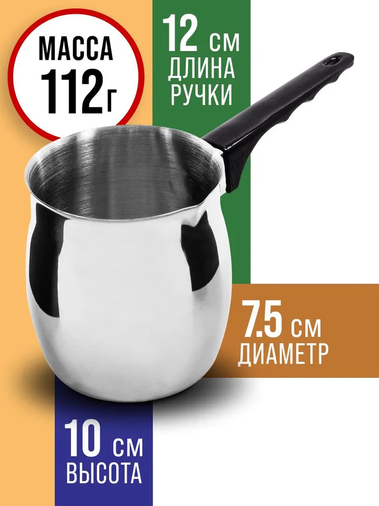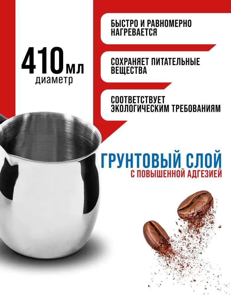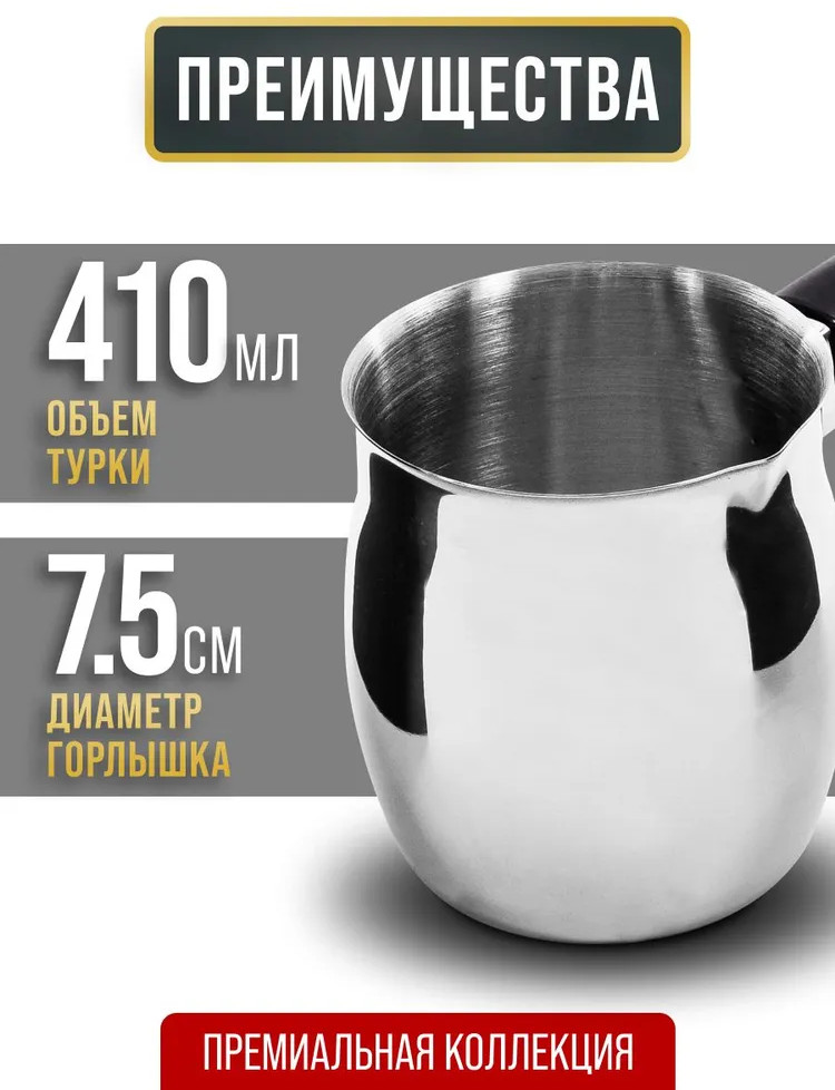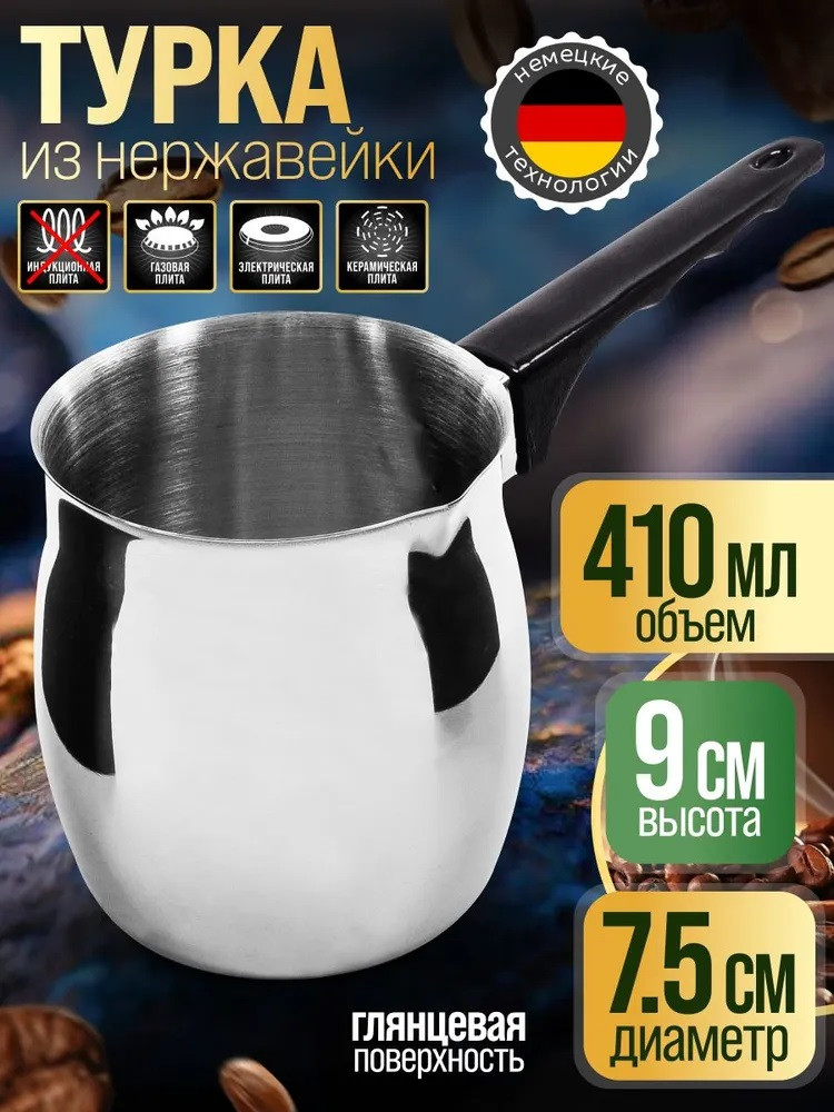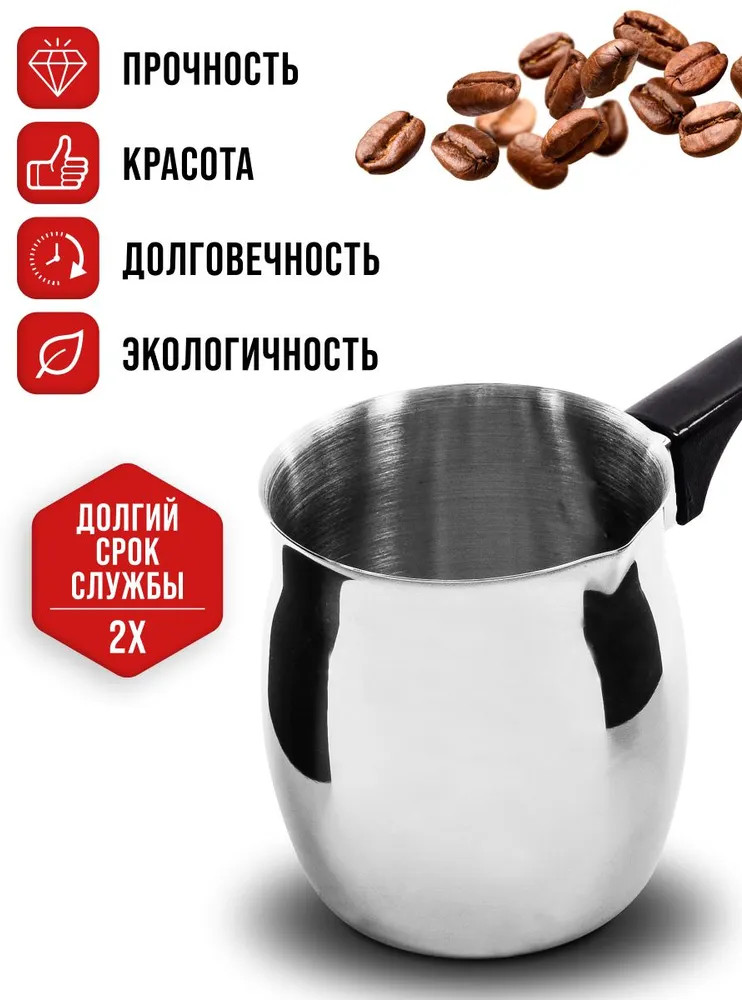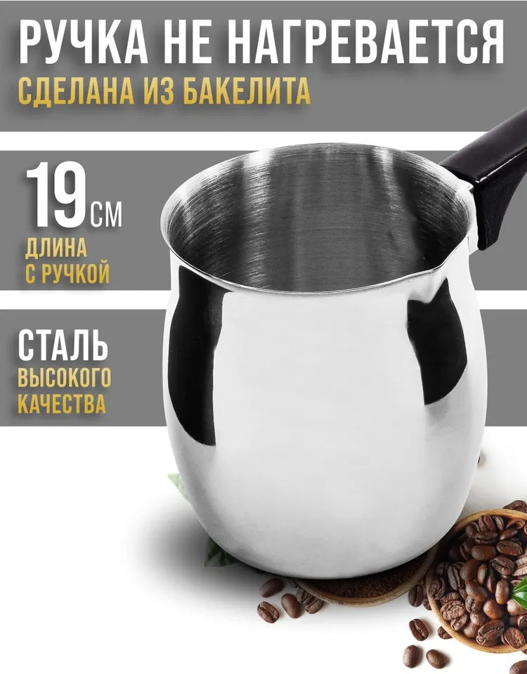 Элегантная и функциональная турка для кофе из высококачественной нержавеющей стали станет прекрасным дополнением вашей кухни. Идеально подходит для варки различных сортов молотого кофе и отлично справляется с разогревом молока и воды. Ручка из черного бакелита обеспечивает комфортное использование, позволяя готовить любимый напиток без риска обжечь руки. Объем в 410 мл обеспечивает достаточное количество кофе для приятного общения с друзьями или семейных завтраков. Стильный дизайн не только привнесет изысканность в кухонный интерьер, но и сделает процесс приготовления кофе настоящим удовольствием. А благодаря возможности мытья в посудомоечной машине, забота о чистоте становится простой и быстрой. Турка — это не просто аксессуар, а возможность наслаждаться каждым утром и создавать атмосферу тепла и уюта.