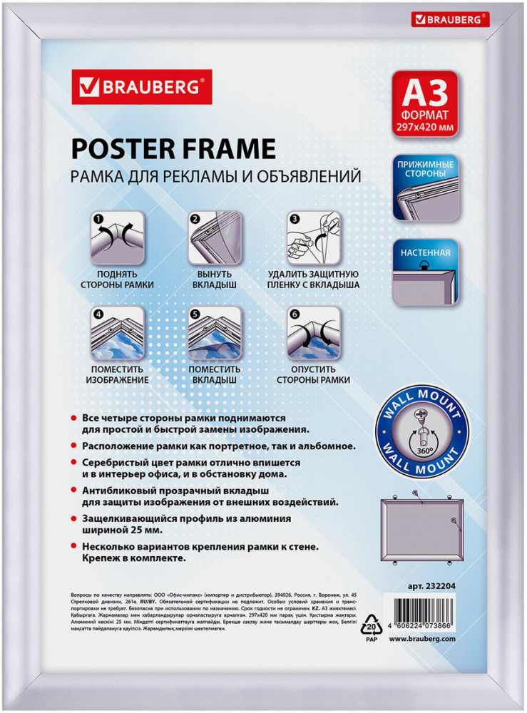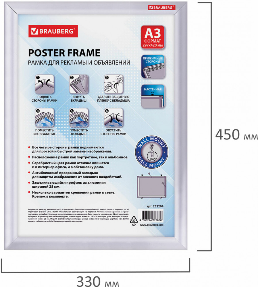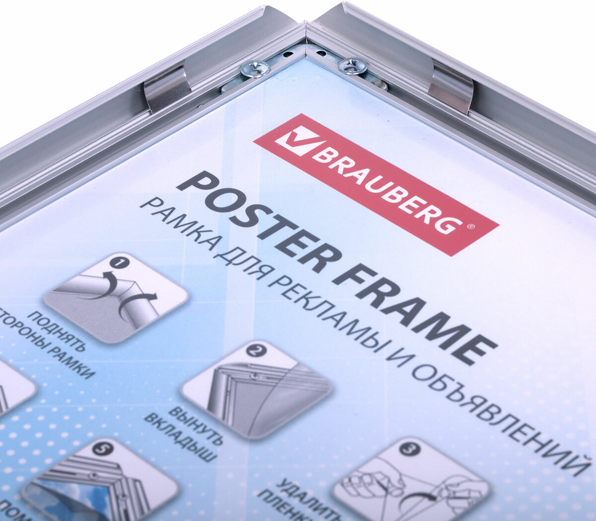 Brauberg Рамка настенная для рекламыВ данный момент этот товар отсутствует в продаже. Возможно, у нас найдется аналогичный или похожий товар здесь. Настенная рамка Brauberg актуальна для рекламных носителей, объявлений и документов, требующих частой замены. Нет необходимости снимать рамку со стены — достаточно поднять прижимные стороны рамки, вынуть антибликовый прозрачный вкладыш и вставить новое изображение. Расположение рамки как портретное, так и альбомное. Элементы крепления прилагаются. Максимальная высота вставляемого листа — 420 мм, максимальная ширина вставляемого листа — 297 мм. Настенная рамка Brauberg для эффектной рекламы — внимание и интерес гарантированы! Стильный минималистичный дизайн, надежность крепления. Закажите сейчас и продвигайте свой бизнес! |