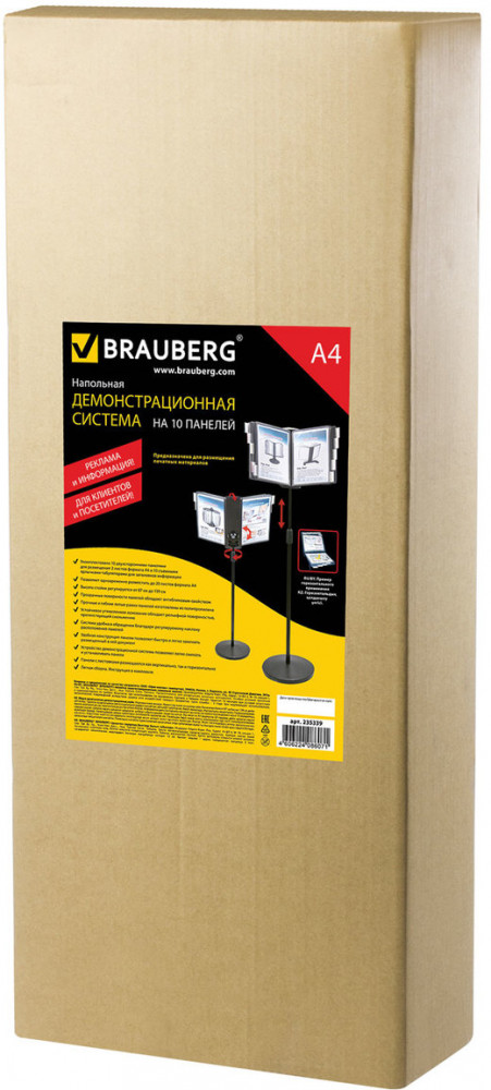 Напольная демонстрационная система BRAUBERG позволяет удобно и быстро разместить информацию о компании, о предлагаемых товара, услугах и ценах, инструкции для персонала и др. 10 двухсторонних панелей серого цвета позволяют разместить одновременно до 20 листов формата А4. Панели с листовками возможно разместить как вертикально, так и горизонтально. Прочные и гибкие литые рамки панелей изготовлены из полипропилена, пригодного для повторной переработки и дальнейшего использования. Демопанели оснащены съемными ярлычками-табуляторами для маркировки и удобного поиска нужной информации. Угол наклона дисплейного модуля регулируется.