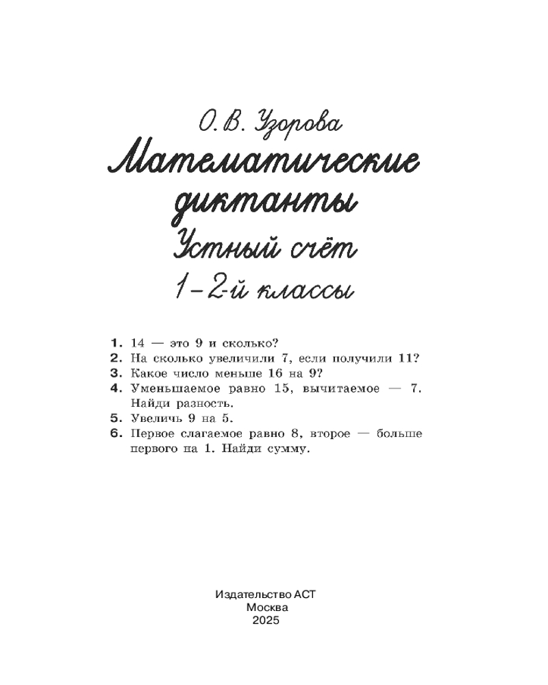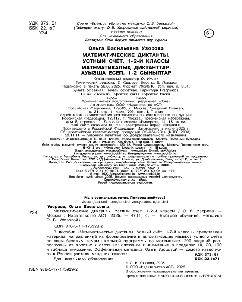 💳 Оплатить за товар можно при получении 🇰🇿 Есть бесплатная доставка по Казахстану от 1 дня 🎁 Копите бонусы с каждой покупки Серия: Быстрое обучение: методика О.В. Узоровой В пособии «Математические диктанты. Устный счёт. 1-2-й классы» представлен материал, направленный на формирование и автоматизацию навыков устного счёта по всем базовым темам школьной программы по математике. 200 заданий расположены от простых к сложным: сложение и вычитание в пределах 10, 20, 100 и таблица умножения. Эффективная методика Ольги Узоровой — самого известного в России учителя младших классов. |