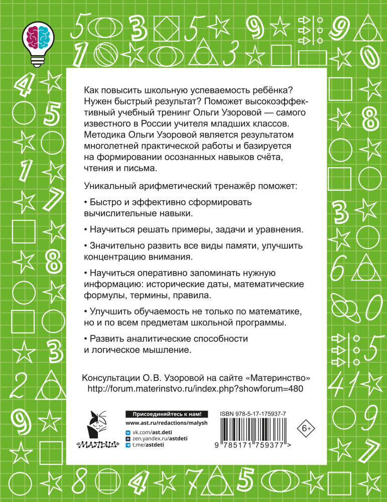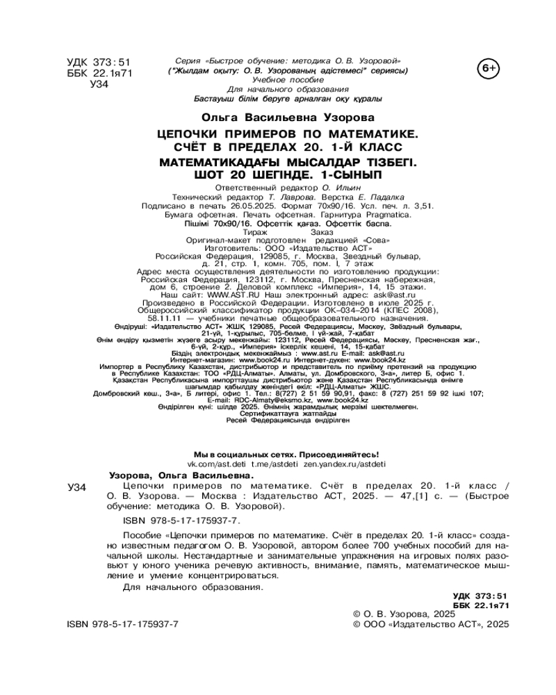 💳 Оплатить за товар можно при получении 🇰🇿 Есть бесплатная доставка по Казахстану от 1 дня 🎁 Копите бонусы с каждой покупки Серия: Быстрое обучение: методика О.В. Узоровой Пособие «Цепочки примеров по математике. Счёт в пределах 20. 1-й класс» создано известным педагогом О. В. Узоровой, автором более 700 учебных пособий для начальной школы. Задания из пособия позволят первокласснику преуспеть в изучении математики. Нестандартные и занимательные упражнения на игровых полях разовьют у юного ученика речевую активность, внимание, память, математическое мышление и умение концентрироваться. Пособие можно использовать для работы в классе и дома для обучения по всем федеральным программам начальной школы. Для начального образования. |