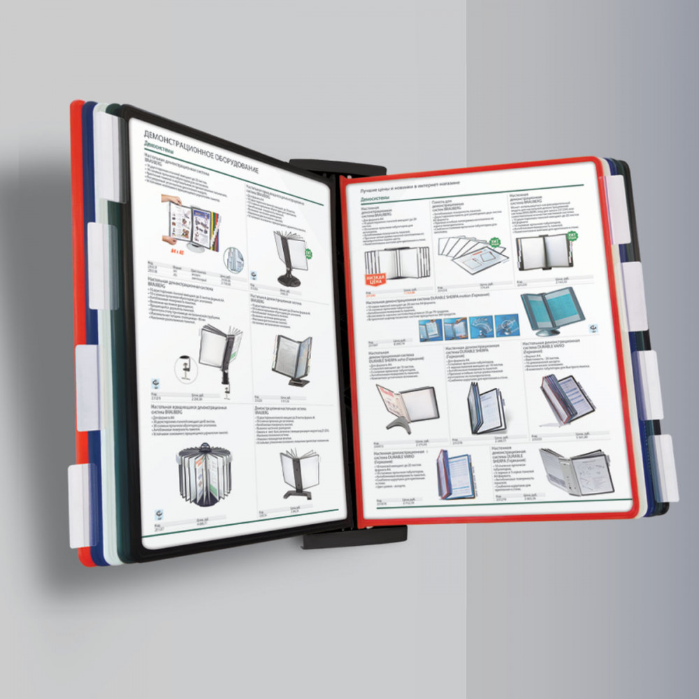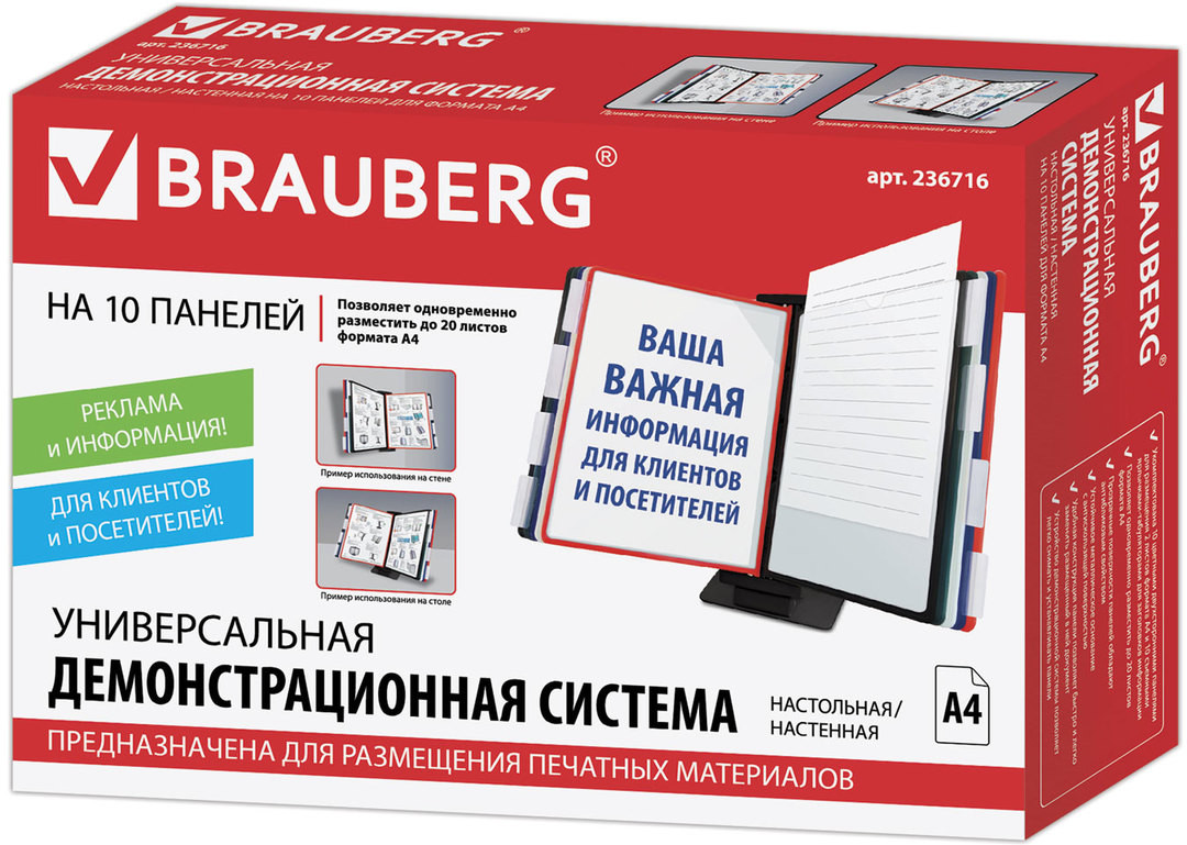 Brauberg Демосистема настольная/настеннаяВ данный момент этот товар отсутствует в продаже. Возможно, у нас найдется аналогичный или похожий товар здесь. Серия: Solid Настольная демонстрационная система Brauberg Solid позволяет удобно и быстро разместить информацию о компании, о предлагаемых товара, услугах и ценах, инструкции для персонала и др. 10 двухсторонних цветных панелей позволяют разместить одновременно до 20 листов формата А4. Прочные и гибкие литые рамки панелей изготовлены из полипропилена, пригодного для повторной переработки и дальнейшего использования. Демопанели оснащены съемными ярлычками-табуляторами для маркировки и удобного поиска нужной информации. Карман демопанели из прочного прозрачного материала с антибликовым покрытием надежно защитит документы от внешних воздействий. Возможно как настольное, так и настенное размещение. Стильный черный цвет пластикового корпуса подойдёт для большинства современных интерьеров. Превратите свою рекламную, справочную информацию в эффективный инструмент с помощью нашей демонстрационной системы Brauberg! Компактна и удобна в использовании. Приобретайте наш товар уже сегодня! |
