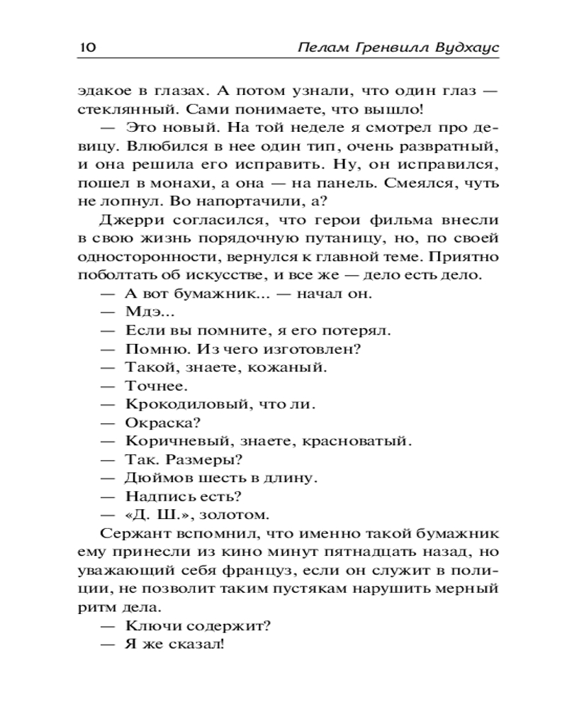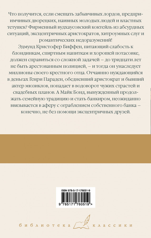 💳 Оплатить за товар можно при получении 🇰🇿 Есть бесплатная доставка по Казахстану от 1 дня 🎁 Копите бонусы с каждой покупки Серия: Библиотека классики Что получится, если смешать забывчивых лордов, предприимчивых дворецких, наивных молодых людей и властных тетушек? Фирменный вудхаусовский коктейль из абсурдных ситуаций, эксцентричных аристократов, хитроумных слуг и романтических недоразумений! Эдмунд Кристофер Биффен, питающий слабость к блондинкам, спиртным напиткам и хорошей потасовке, должен справиться со сложной задачей — до тридцати лет не быть арестованным полицией, — и тогда он унаследует миллионы своего крестного отца. Отчаянно нуждающийся в деньгах Генри Параден, обедневший аристократ и бывший актер мюзиклов, попадает в водоворот чужих страстей и свадебных планов. А Майк Бонд, вынужденный продолжать семейную традицию и стать банкиром, неожиданно ввязывается в аферу с ограблением собственного банка — конечно, не без помощи эксцентричных друзей. |