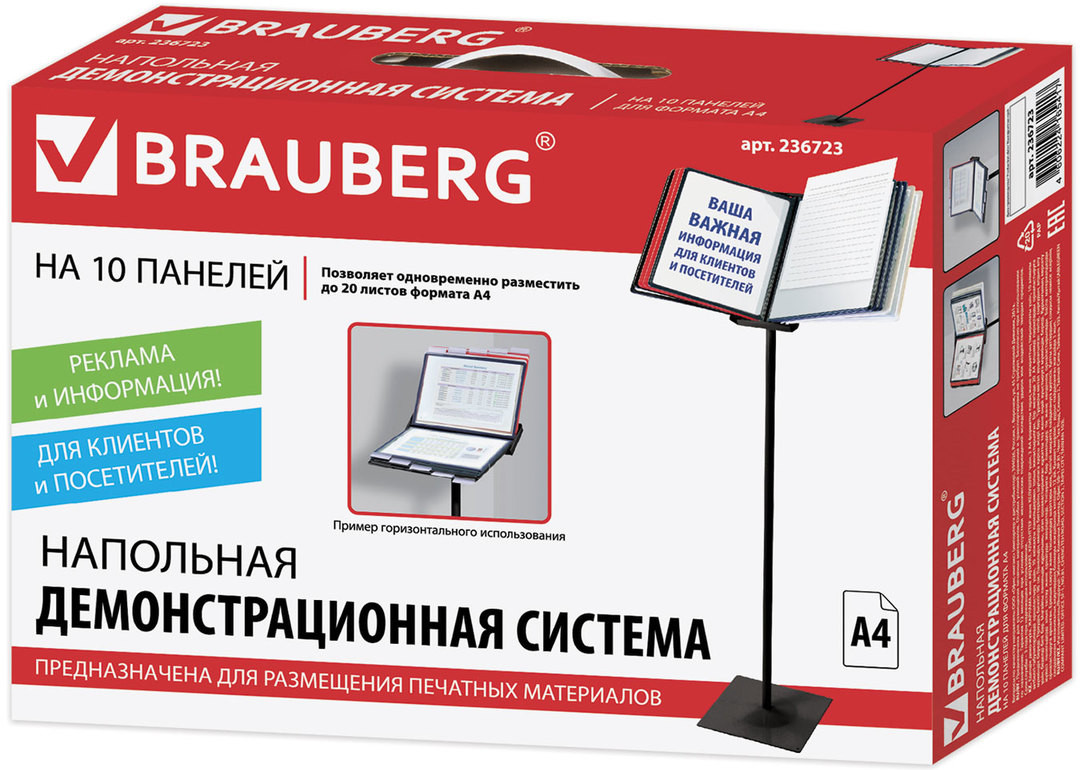 Напольная демонстрационная система Brauberg Solid позволяет удобно и быстро разместить информацию о компании, о предлагаемых товарах, услугах и ценах, инструкции для персонала и др. 10 двухсторонних цветных панелей позволяют разместить одновременно до 20 листов формата А4. Панели с листовками возможно разместить как вертикально, так и горизонтально. Прочные и гибкие литые рамки панелей изготовлены из полипропилена, пригодного для повторной переработки и дальнейшего использования. Демопанели оснащены съемными ярлычками-табуляторами для маркировки и удобного поиска нужной информации.