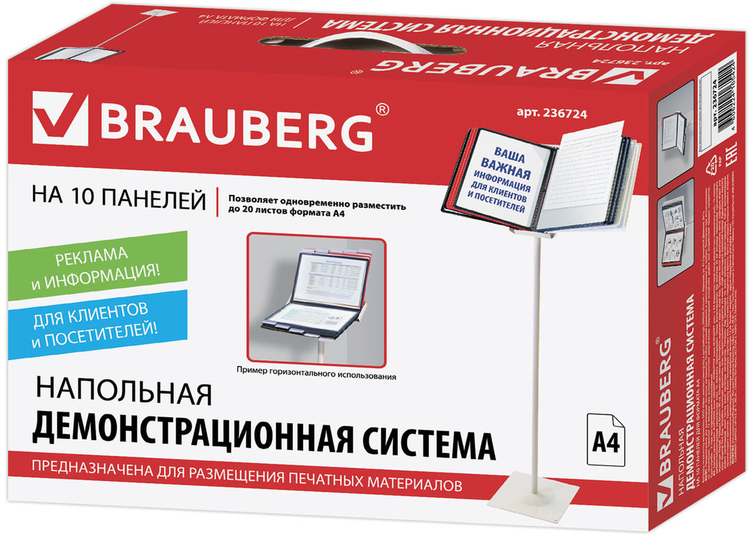 Напольная демонстрационная система Brauberg Solid позволяет удобно и быстро разместить информацию о компании, о предлагаемых товара, услугах и ценах, инструкции для персонала и др. 10 двухсторонних цветных панелей позволяют разместить одновременно до 20 листов формата А4. Панели с листовками возможно разместить как вертикально, так и горизонтально. Прочные и гибкие литые рамки панелей изготовлены из полипропилена, пригодного для повторной переработки и дальнейшего использования. Демопанели оснащены съемными ярлычками-табуляторами для маркировки и удобного поиска нужной информации.