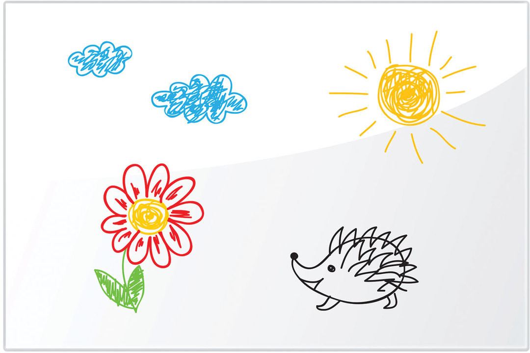 Рабочая поверхность белого цвета изготовлена из небьющегося стекла. Размер доски — 60×90 см. Надежно упакована в защитную пленку и красочную подарочную коробку с ручкой. 3 специальных неодимовых магнита и элементы крепления входят в комплект. Скрытый тип крепления с задней стороны поможет вписать доску в любой интерьер.