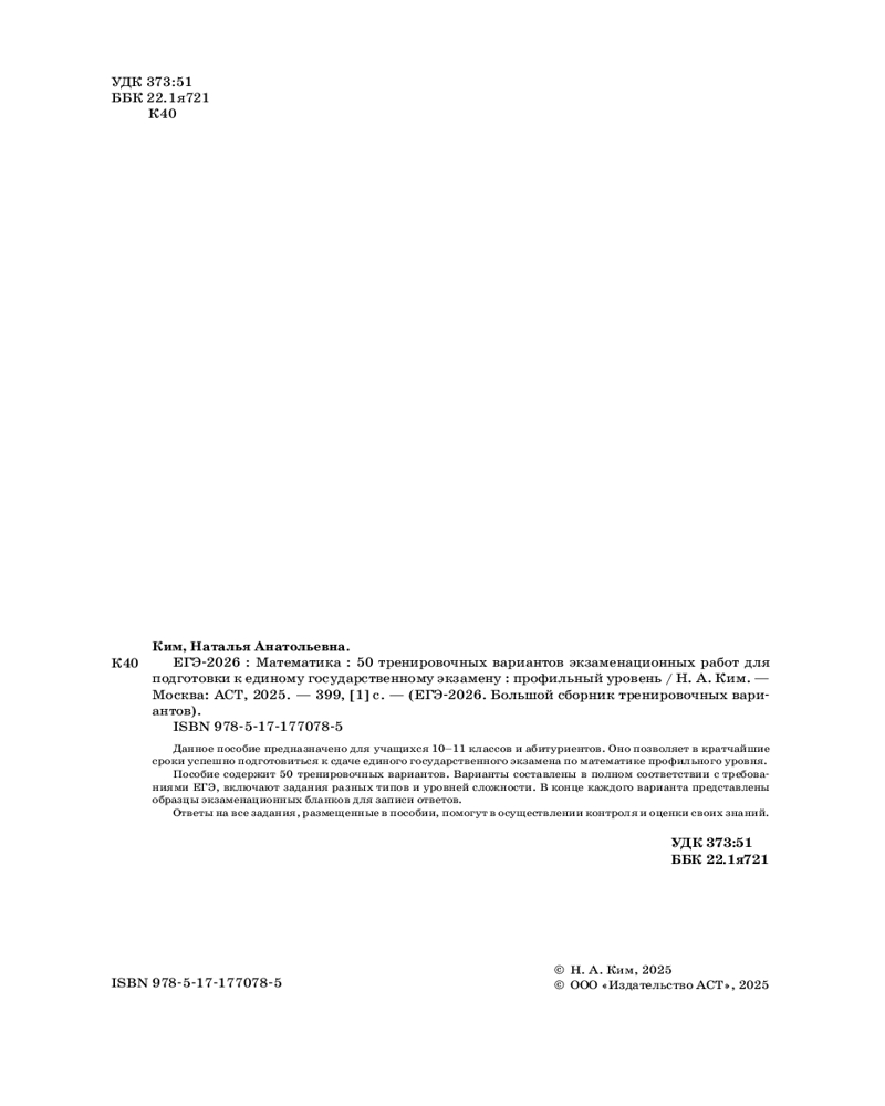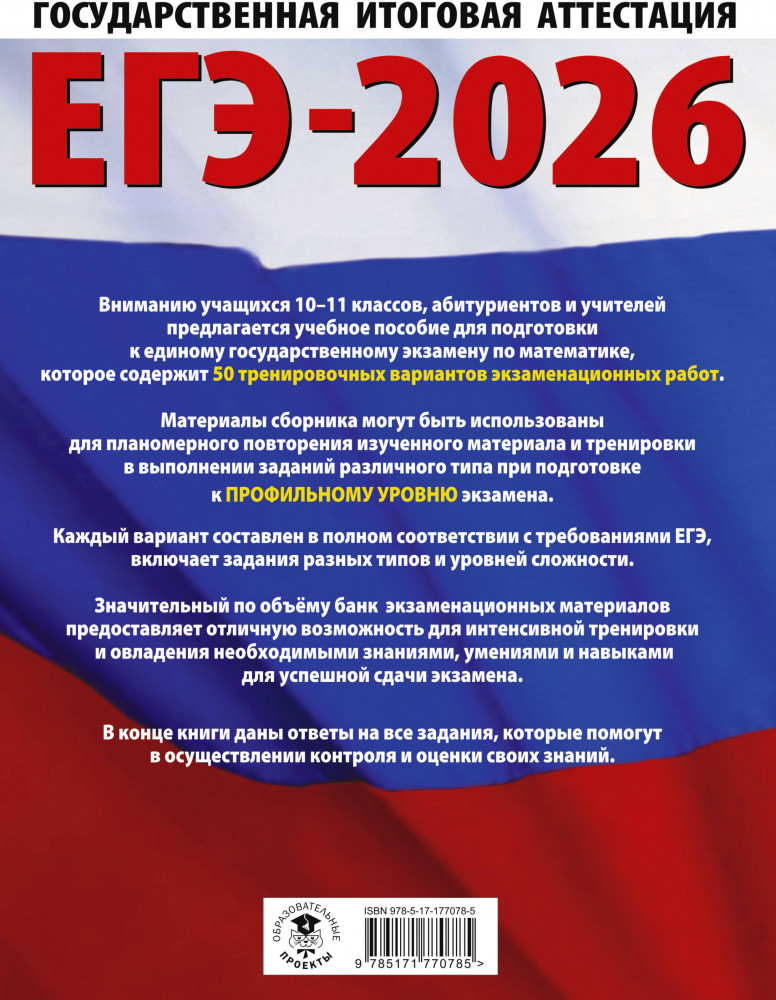 💳 Оплатить за товар можно при получении 🇰🇿 Есть бесплатная доставка по Казахстану от 1 дня 🎁 Копите бонусы с каждой покупки Серия: ЕГЭ-2026. Большой сборник тренировочных вариантов Данное пособие предназначено для учащихся 10–11 классов и абитуриентов. Оно позволяет в кратчайшие сроки успешно подготовиться к сдаче единого государственного экзамена по математике профильного уровня. Пособие содержит 50 тренировочных вариантов. Варианты составлены в полном соответствии с требованиями ЕГЭ, включают задания разных типов и уровней сложности. В конце каждого варианта представлены образцы экзаменационных бланков для записи ответов. Ответы на все задания, размещенные в пособии, помогут в осуществлении контроля и оценки своих знаний. |