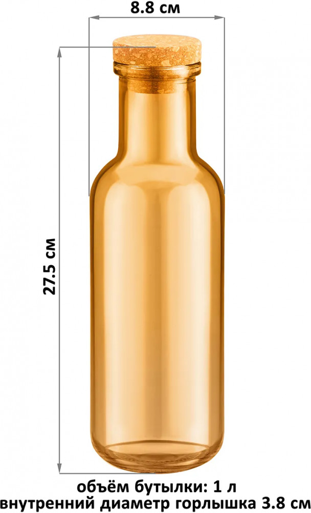 Серия: Glaskraft Бутылка из серии «Glaskraft» от Elan Gallery послужит универсальным органайзером. Размер ёмкости — 8,8×8,8×27,5 см, объём — 1 литр. Внутренний диаметр горлышка — 3,8 см. Выполнена из стекла, крышка — из пробки. Экологичная баночка насыщенного оранжевого цвета предназначена для хранения питьевой воды, лимонадов, компотов и других напитков, дополнив сервировку стола необычной подачей. Вместительная бутыль подойдёт и для сыпучих продуктов: сахара, соли и круп. Полупрозрачные стенки позволят следить за количеством содержимого, а пробковая крышка надёжно защитит от грязи и пыли.