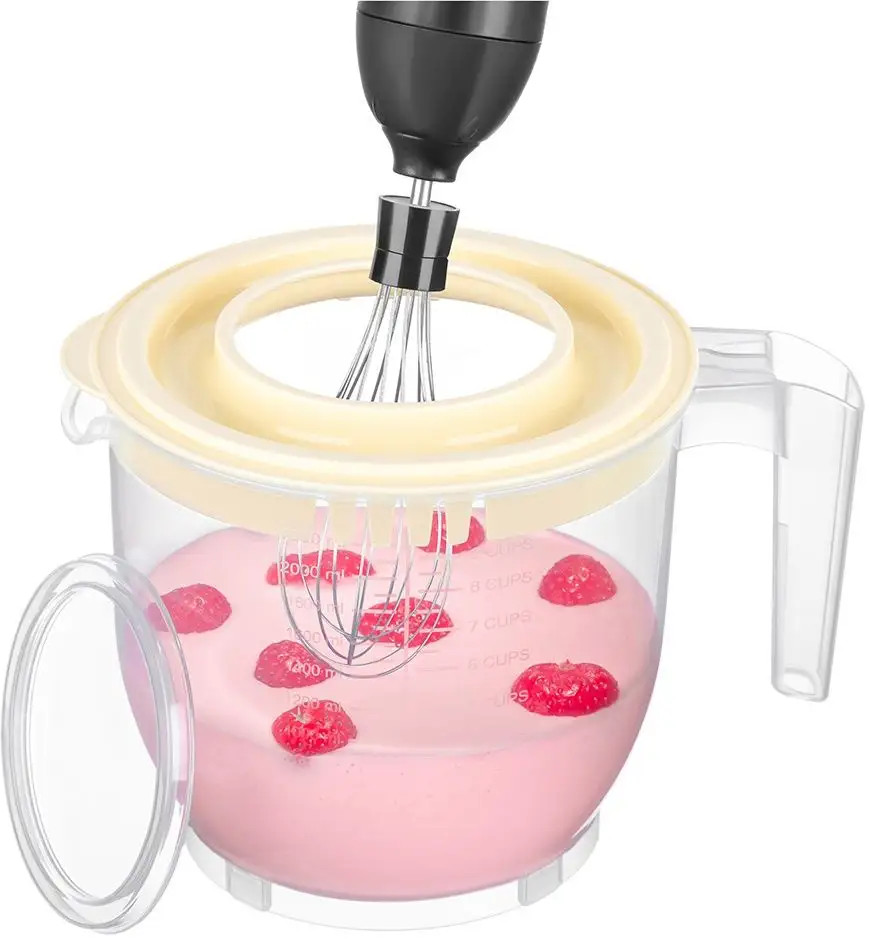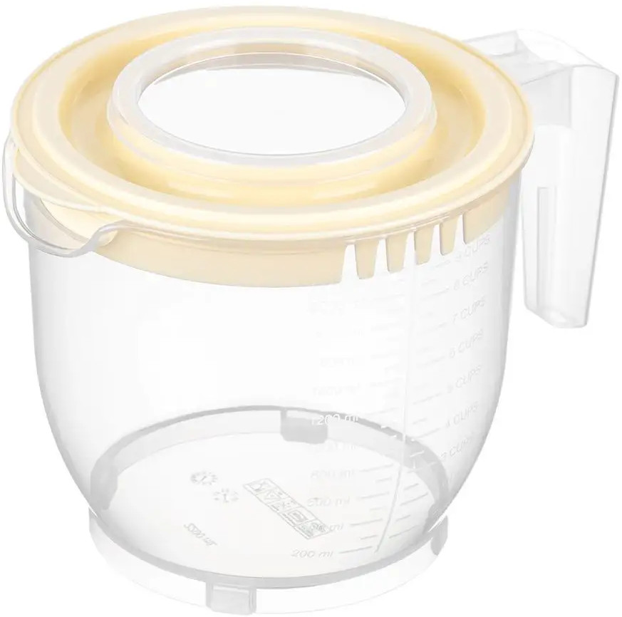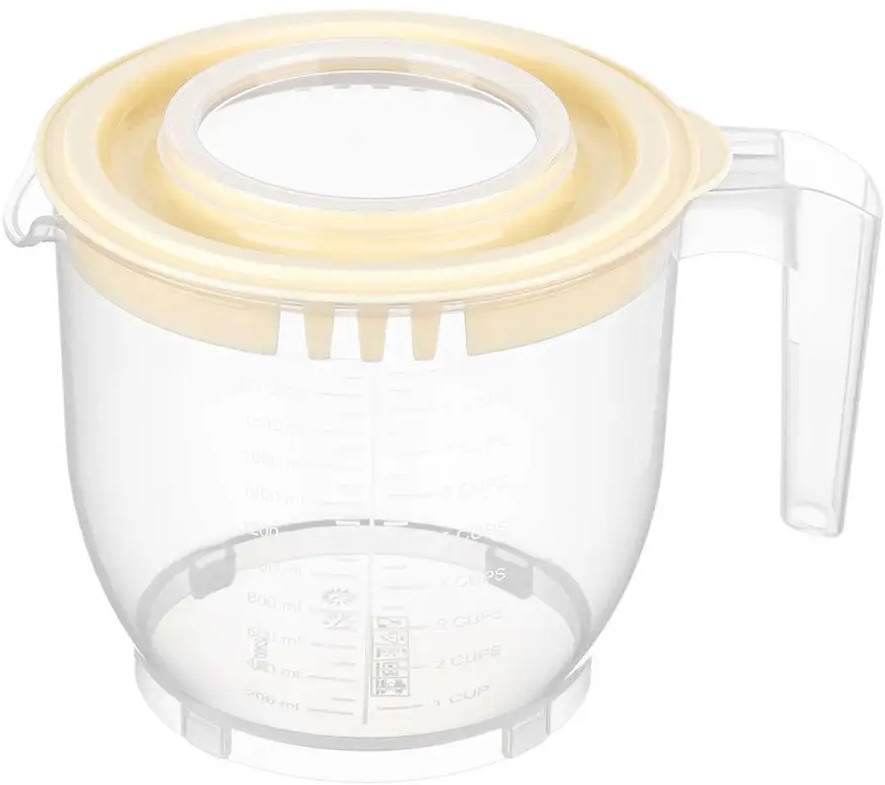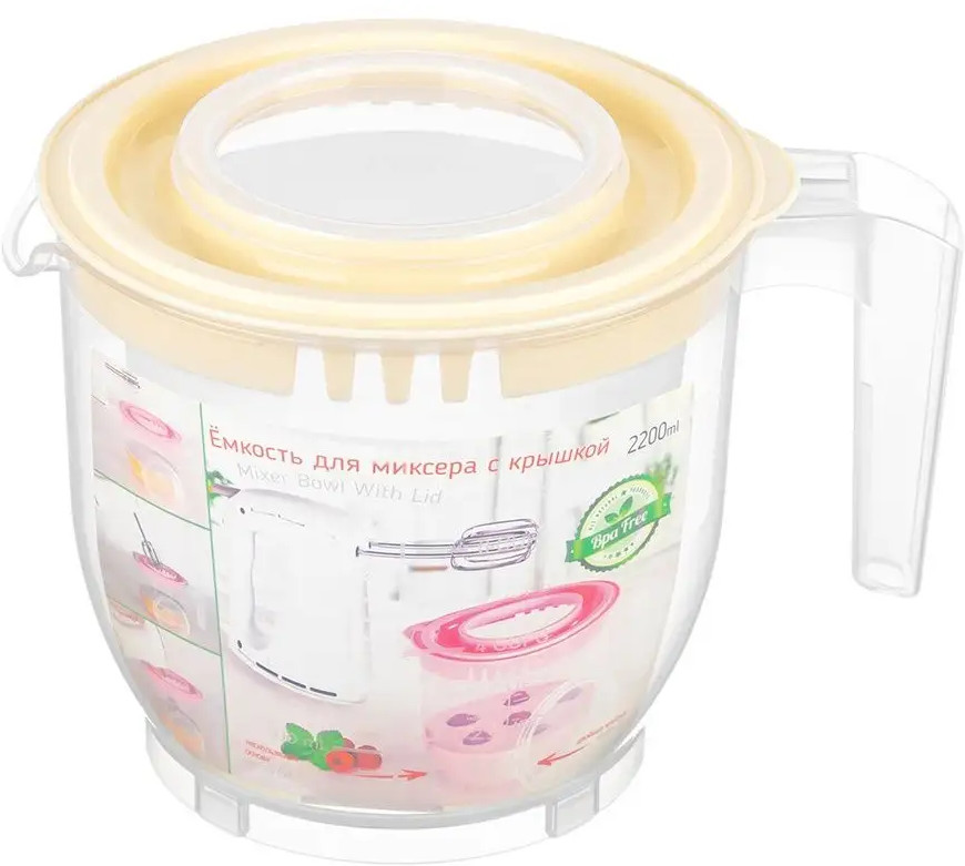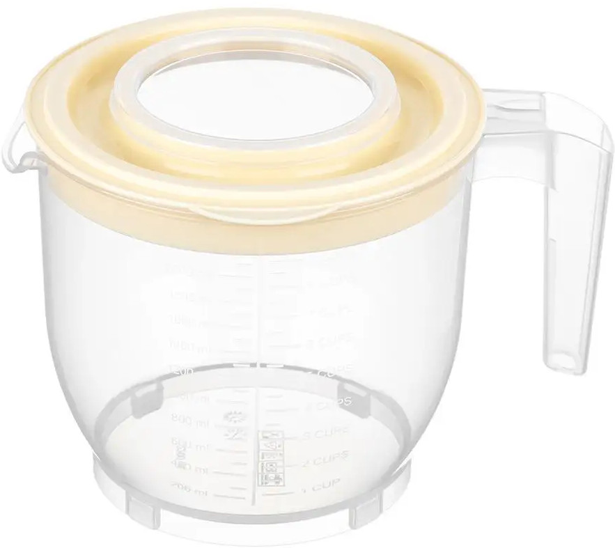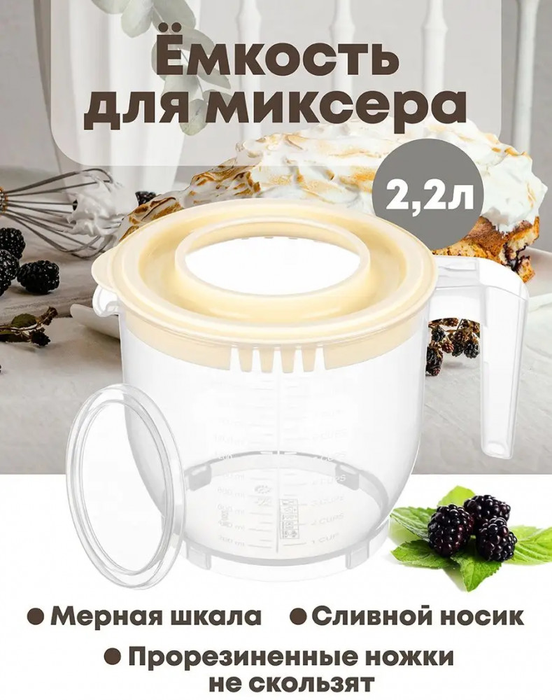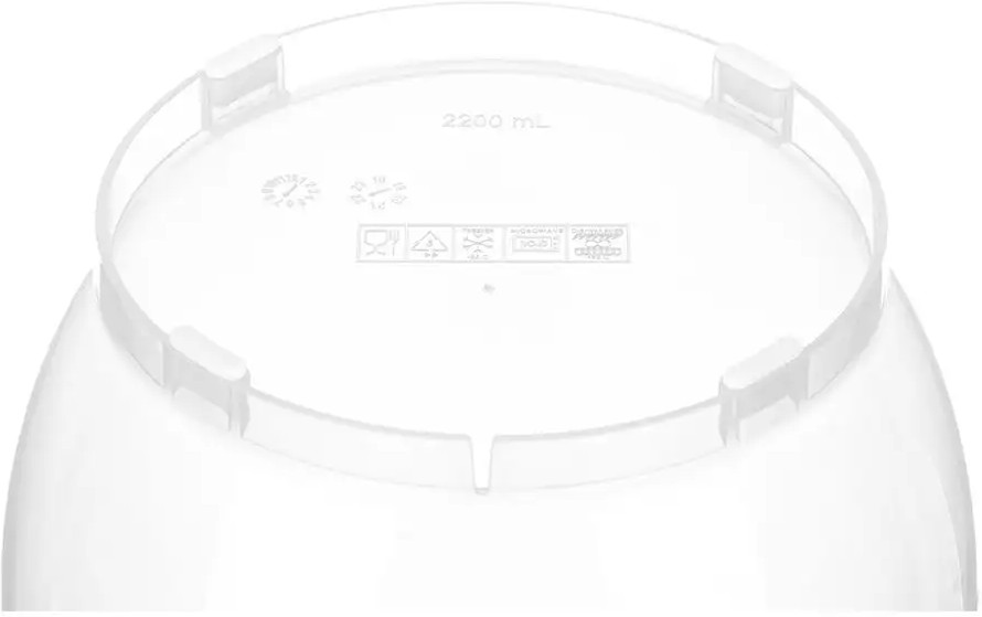Его можно использовать в микроволновой печи, посудомоечной машине, холодильнике и морозильной камере. Большая глубокая чаша имеет прозрачные стенки и мерную шкалу. Удобно использовать для смешивания разных продуктов, приготовления крема, смузи или смеси. Используйте блендер и другие кухонные принадлежности, не боясь испачкать кухню брызгами благодаря высоким стенкам миски. Пластмассовая ёмкость оснащена удобной ручкой. Ножки прорезиненные: кружка для миксера не будет скользить. Имеет носик для слива, поэтому содержимое удобно переливать. Перегородки для носика на основании крышки помогут регулировать скорость слива готовой массы. Можно использовать как кувшин, тогда при разливании напитков перегородка будет фильтром и оставит крупные ингредиенты внутри ёмкости. Пластиковая чашка для блендера станет удобным дополнением вашей кухни.