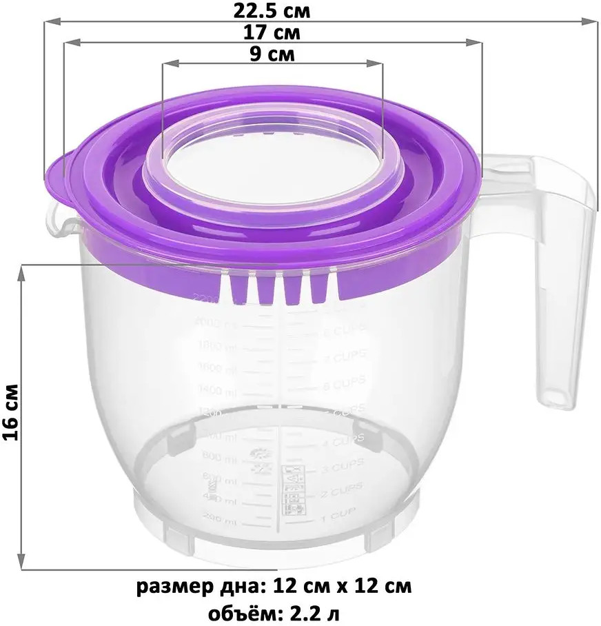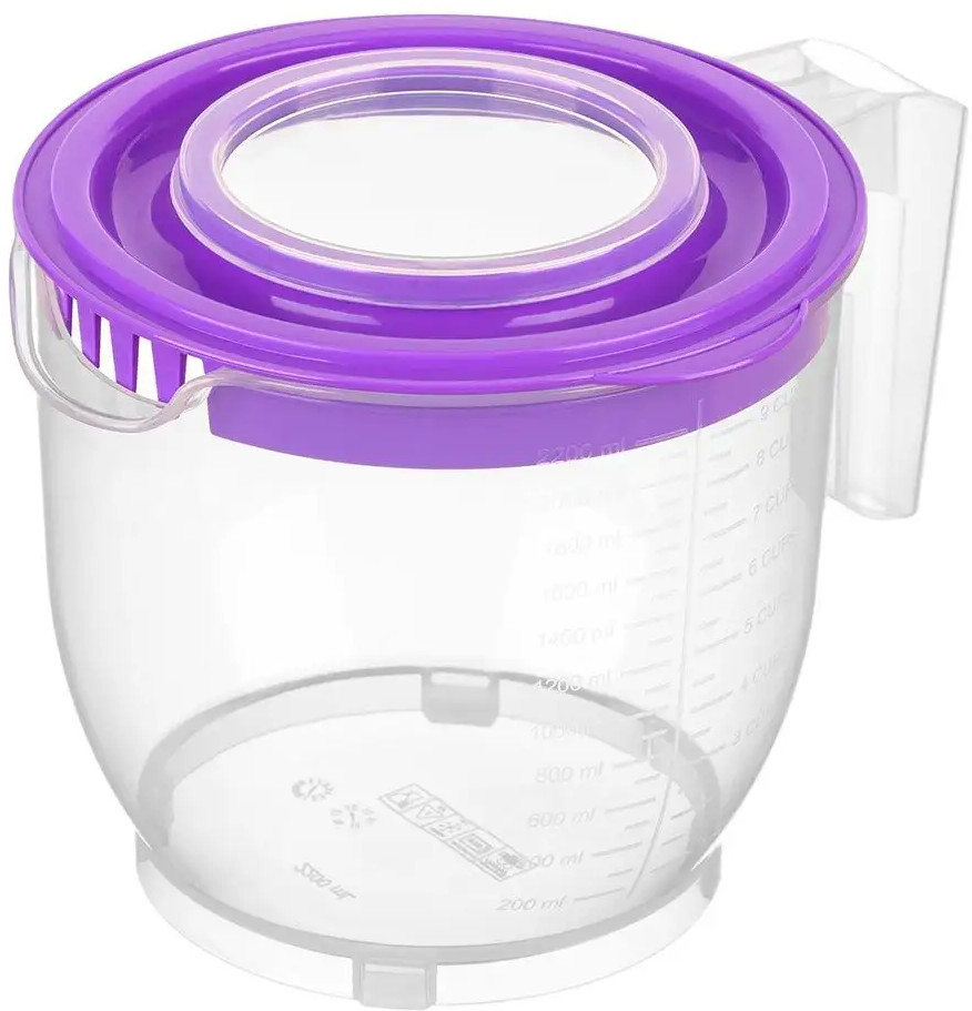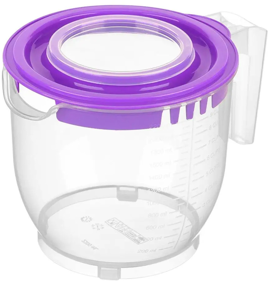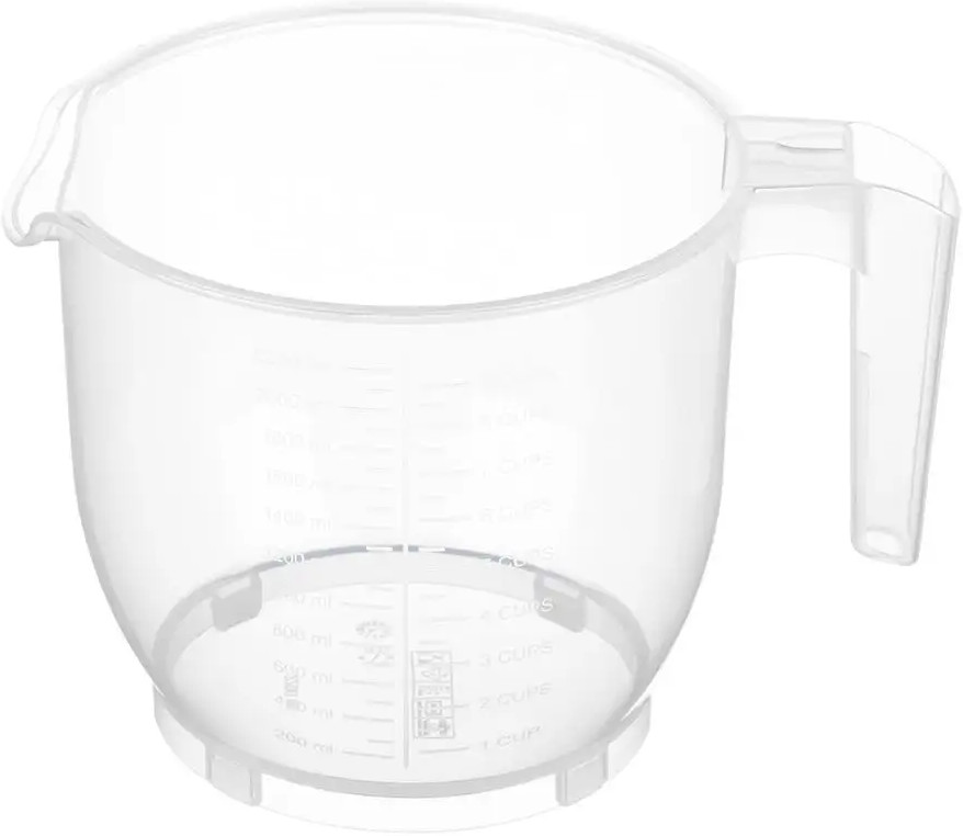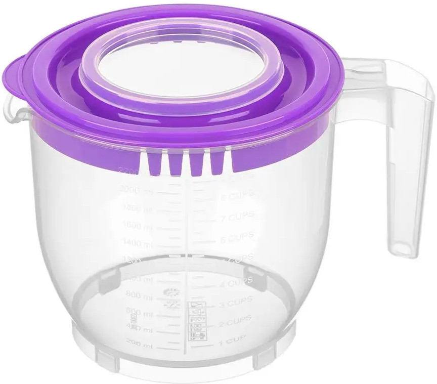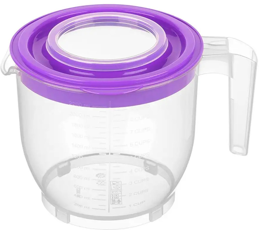 Его можно использовать в микроволновой печи, посудомоечной машине, холодильнике и морозильной камере. Большая глубокая чаша имеет прозрачные стенки и мерную шкалу. Удобно использовать для смешивания разных продуктов, приготовления крема, смузи или смеси. Используйте блендер и другие кухонные принадлежности, не боясь испачкать кухню брызгами благодаря высоким стенкам миски. Пластмассовая ёмкость оснащена удобной ручкой. Ножки прорезиненные: кружка для миксера не будет скользить. Имеет носик для слива, поэтому содержимое удобно переливать. Перегородки для носика на основании крышки помогут регулировать скорость слива готовой массы. Можно использовать как кувшин, тогда при разливании напитков перегородка будет фильтром и оставит крупные ингредиенты внутри ёмкости. Пластиковая чашка для блендера станет удобным дополнением вашей кухни.