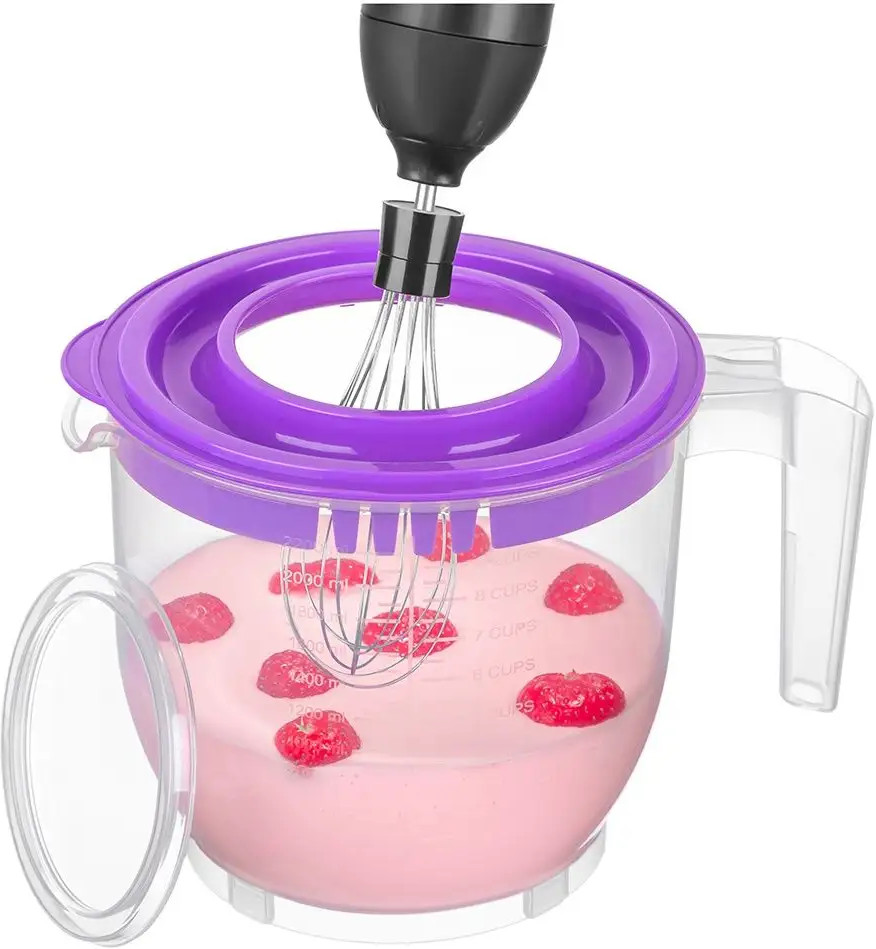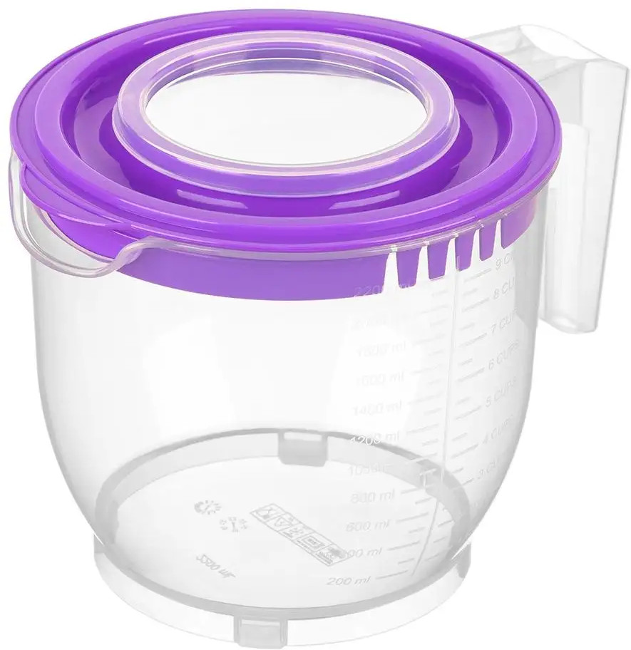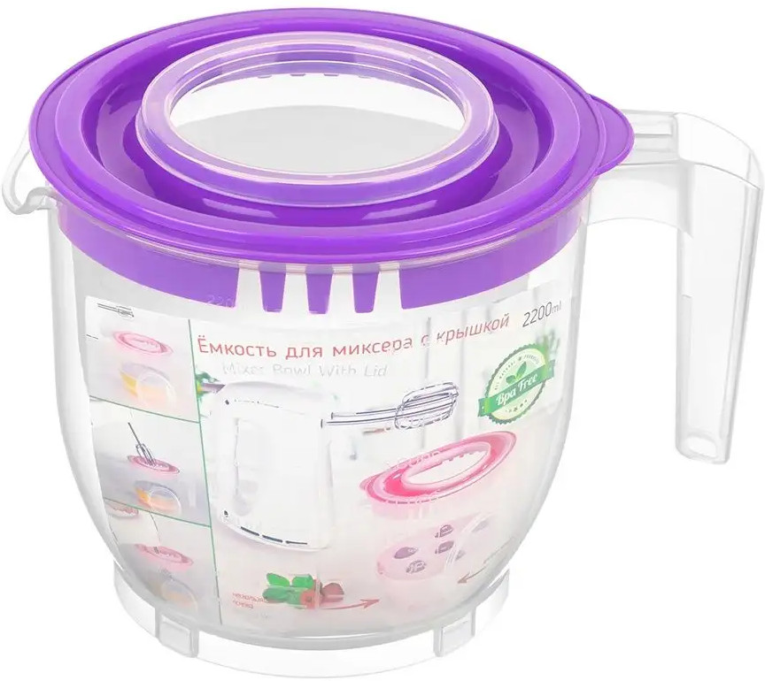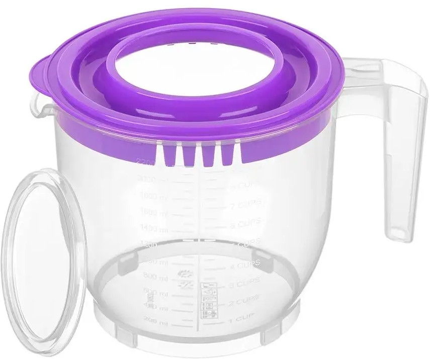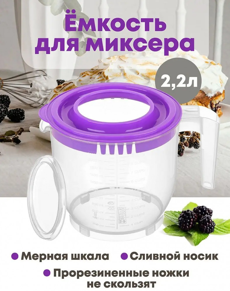 Его можно использовать в микроволновой печи, посудомоечной машине, холодильнике и морозильной камере. Большая глубокая чаша имеет прозрачные стенки и мерную шкалу. Удобно использовать для смешивания разных продуктов, приготовления крема, смузи или смеси. Используйте блендер и другие кухонные принадлежности, не боясь испачкать кухню брызгами благодаря высоким стенкам миски. Пластмассовая ёмкость оснащена удобной ручкой. Ножки прорезиненные: кружка для миксера не будет скользить. Имеет носик для слива, поэтому содержимое удобно переливать. Перегородки для носика на основании крышки помогут регулировать скорость слива готовой массы. Можно использовать как кувшин, тогда при разливании напитков перегородка будет фильтром и оставит крупные ингредиенты внутри ёмкости. Пластиковая чашка для блендера станет удобным дополнением вашей кухни.
