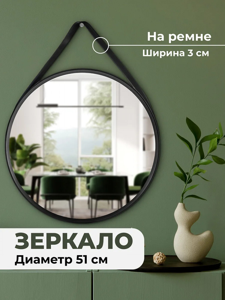 Настенное зеркало на ремне от бренда El Casa станет украшением домашнего интерьера квартиры или дачи, а также позволит следить за вашей красотой в течение дня. Размер 51×51×3 см. Большое интерьерное зеркальце круглой формы имеет прочный ремешок для подвешивания на стену или дверь, что позволяет без труда разместить его в спальне или прихожей. Длина ремня 110 см, ширина ремня 3 см.