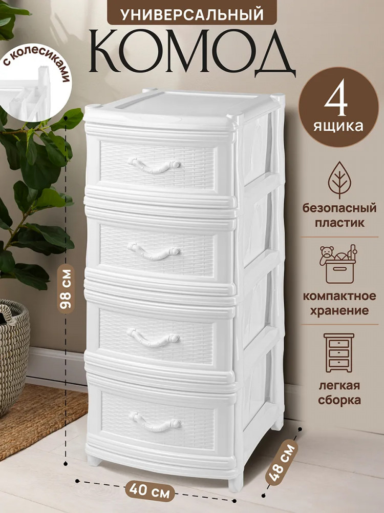 Благодаря стильному дизайну он украсит интерьер спальни, ванной, кухни или прихожей. Конструкция состоит из четырёх выдвижных ящиков, помогающих эффективно организовывать пространство. Напольная модель устойчива, а благодаря лёгкому весу и колёсикам её удобно перемещать. Шкаф позволит создать дополнительное пространство для хранения обуви и аксессуаров в коридоре, гардеробной и даже на балконе. Подходит для хранения белья и детских игрушек. Послужит прикроватным органайзером в спальне и поможет хранить продукты на кухне. Такой шкафчик пригодится не только дома, но и на даче. Он подойдёт для хранения инструментов, хозяйственного инвентаря и предметов для рукоделия. Универсальный комод поможет вам поддерживать порядок в офисе, компактно хранить канцелярию, бумагу и документы.