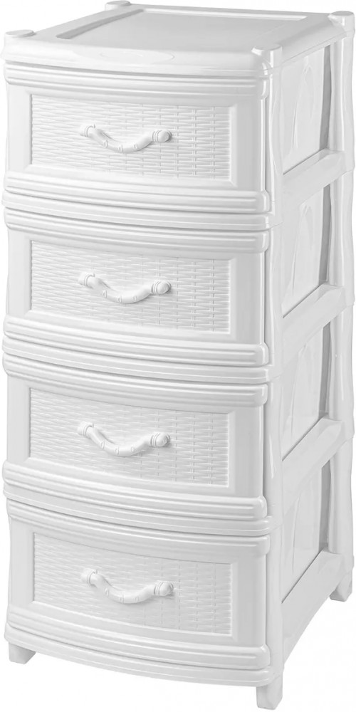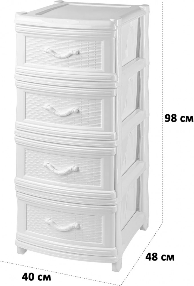 Четырёхсекционный комод от El Casa поможет с организацией хранения в вашем доме. Размер изделия — 40×48×98 см. Размер каждого ящика по верху — 44×32×19,5 см, по дну — 43×30 см. Выполнен из полипропилена — прочного пластика, который не содержит бисфенол А и другие вредные вещества. За счёт своей экологичности комод подходит для хранения посуды, овощей и фруктов, а также любых других продуктов. Пластиковый шкаф с рельефным узором — это практичное решение для хранения любых вещей! Компактный, но вместительный комодик подойдёт для одежды, косметики и документов.