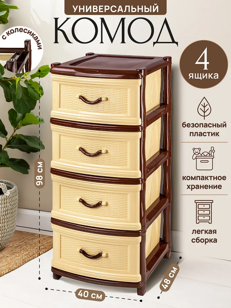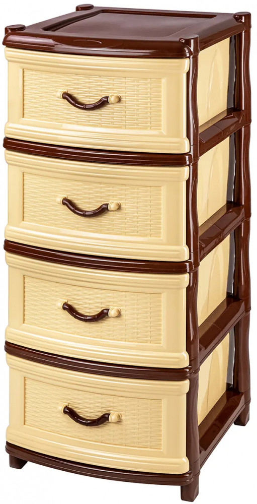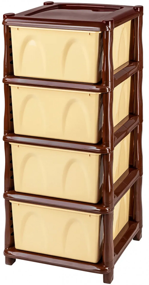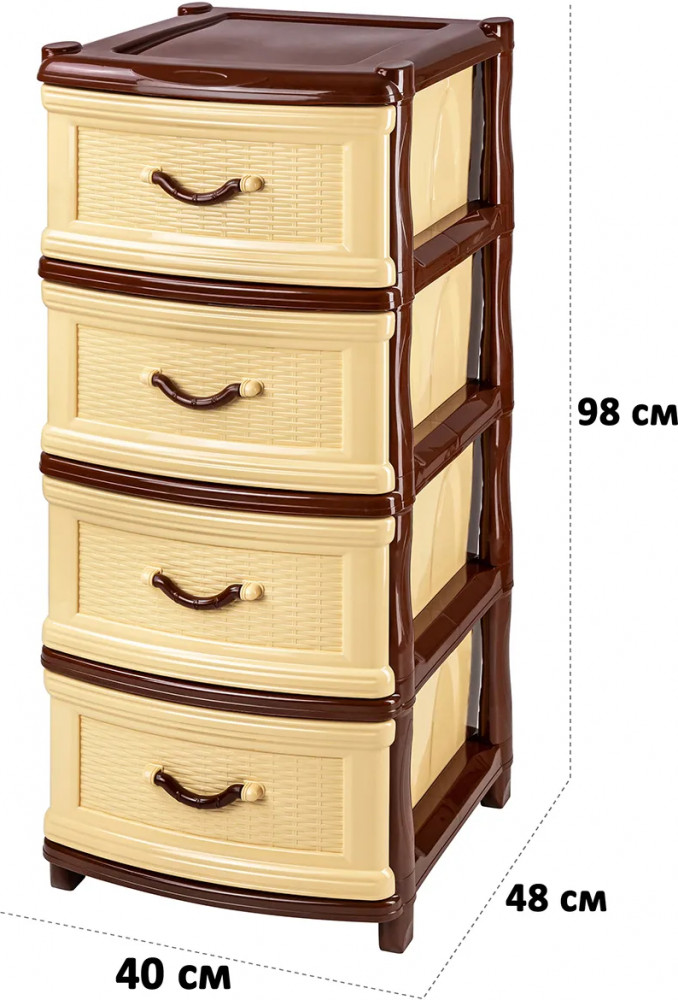 Четырёхсекционный комод от El Casa поможет с организацией хранения в вашем доме. Размер изделия — 40×48×98 см. Размер каждого ящика по верху — 44×32×19,5 см, по дну — 43×30 см. Выполнен из полипропилена — прочного пластика, который не содержит бисфенол А и другие вредные вещества. За счёт своей экологичности комод подходит для хранения посуды, овощей и фруктов, а также любых других продуктов. Пластиковый шкаф с рельефным узором — это практичное решение для хранения любых вещей! Компактный, но вместительный комодик подойдёт для одежды, косметики и документов.