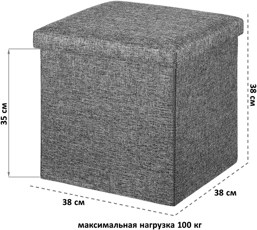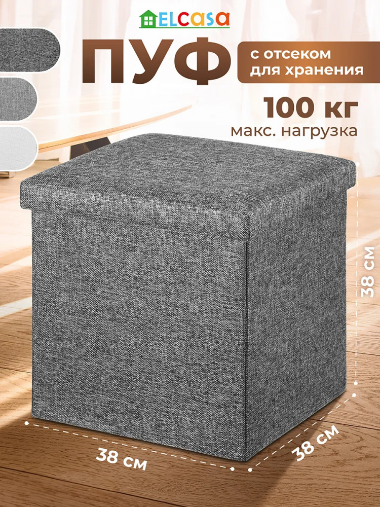 Складной пуф от бренда Elcasa 38×38×38 см выполнен из нетканого материала, хлопка и льна. Имеет приятную на ощупь текстуру и плотные вставки из МДФ. Благодаря данным материалам в составе отлично держит форму куба. Высота без крышки 35 см. Выдерживает нагрузку до 100 кг. Крышка, которая выполняет роль сиденья, полностью снимается. Квадратный пуфик — это универсальное решение 3 в 1. Компактная мебель справится сразу с несколькими задачами: декор интерьера, место для хранения вещей и использование в качестве небольшой табуретки. Под съёмной крышечкой скрывается вместительный отсек. Во внутреннее отделение удобно сложить вещи, которые нужно держать под рукой. Это может быть плед на балконе, обувь в коридоре и различные мелочи и аксессуары в прихожей или гардеробной. Прямоугольный пуф с ящиком поможет поддерживать порядок в любом уголке дома. Он органично впишется в интерьер гостиной или спальни, а также подойдёт для хранения игрушек в детской комнате.