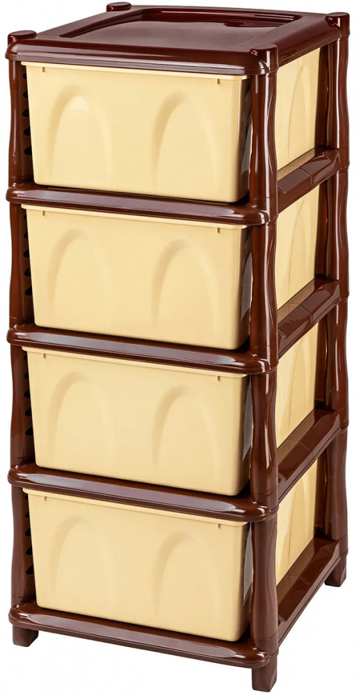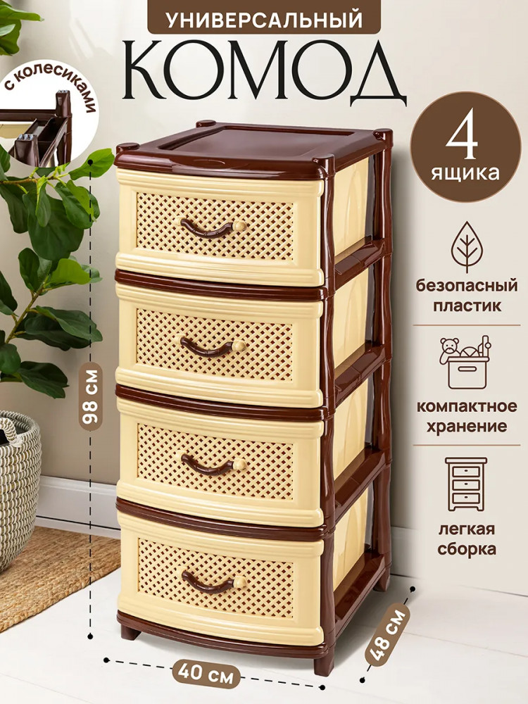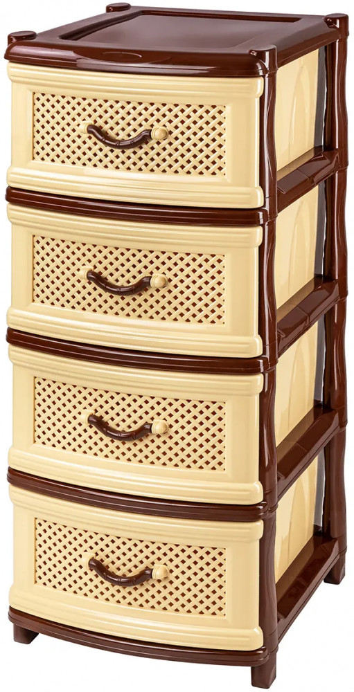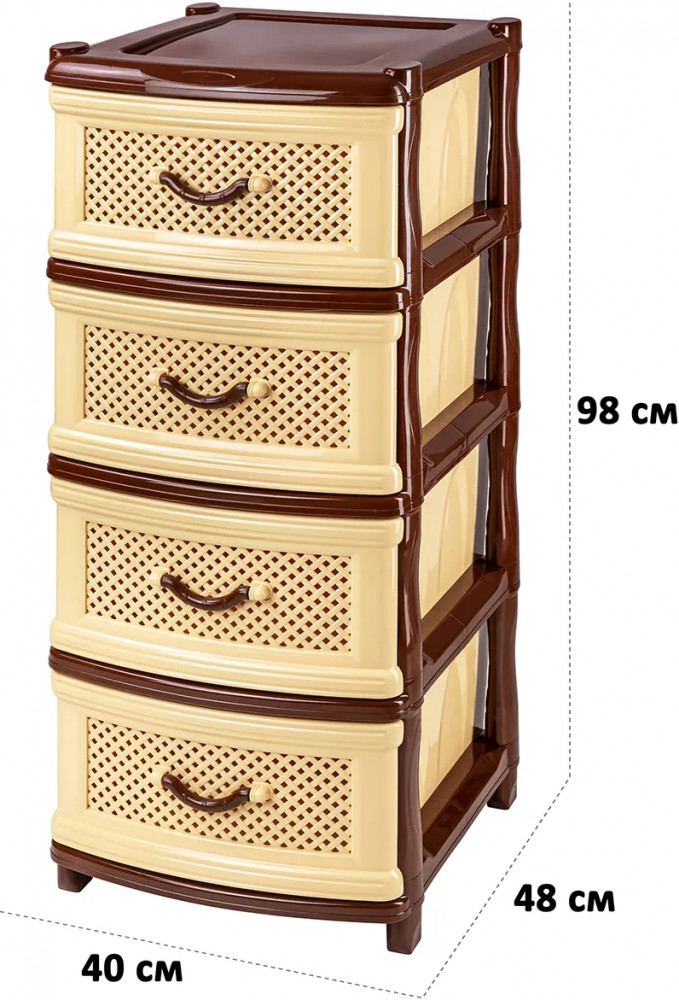 Четырёхсекционный комод от El Casa поможет с организацией хранения в вашем доме. Размер изделия — 40×48×98 см. Размер каждого ящика по верху — 44×32×19,5 см, по дну — 43×30 см. Выполнен из полипропилена — прочного пластика, который не содержит бисфенол А и другие вредные вещества. За счёт своей экологичности комод подходит для хранения посуды, овощей и фруктов, а также любых других продуктов. Пластиковый шкаф с рельефным узором — это практичное решение для хранения любых вещей! Компактный, но вместительный комодик подойдёт для одежды, косметики и документов.