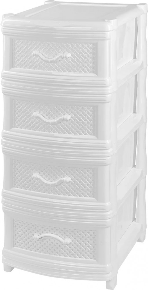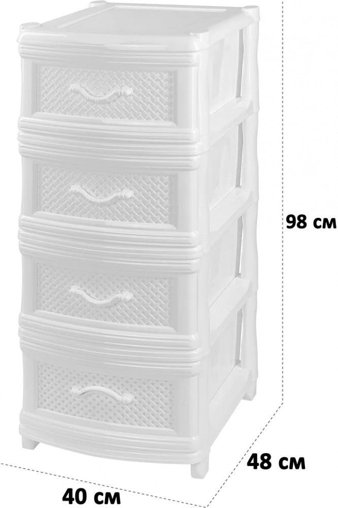 Четырёхсекционный комод от El Casa поможет с организацией хранения в вашем доме. Размер изделия — 40×48×98 см. Размер каждого ящика по верху — 44×32×19,5 см, по дну — 43×30 см. Выполнен из полипропилена — прочного пластика, который не содержит бисфенол А и другие вредные вещества. За счёт своей экологичности комод подходит для хранения посуды, овощей и фруктов, а также любых других продуктов. Пластиковый шкаф с рельефным узором — это практичное решение для хранения любых вещей! Компактный, но вместительный комодик подойдёт для одежды, косметики и документов.