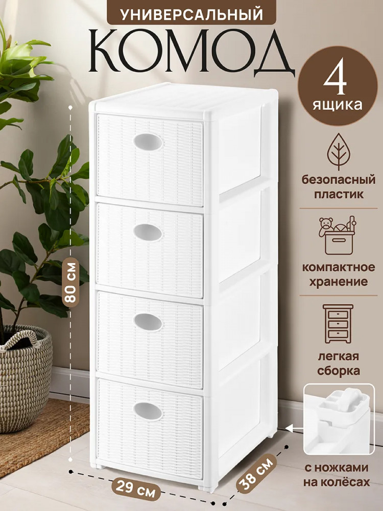 Благодаря стильному дизайну он украсит интерьер спальни, ванной, кухни или прихожей. Конструкция состоит из четырёх выдвижных ящиков, помогающих эффективно организовывать пространство. Напольная модель устойчива, а благодаря лёгкому весу и колёсикам её удобно перемещать. Шкаф позволит создать дополнительное пространство для хранения обуви и аксессуаров в коридоре, гардеробной и даже на балконе. Подходит для хранения белья и детских игрушек. Послужит прикроватным органайзером в спальне и поможет хранить продукты на кухне. Такой шкафчик пригодится не только дома, но и на даче. Он подойдёт для хранения инструментов, хозяйственного инвентаря и предметов для рукоделия. Универсальный комод поможет вам поддерживать порядок в офисе, компактно хранить канцелярию, бумагу и документы.