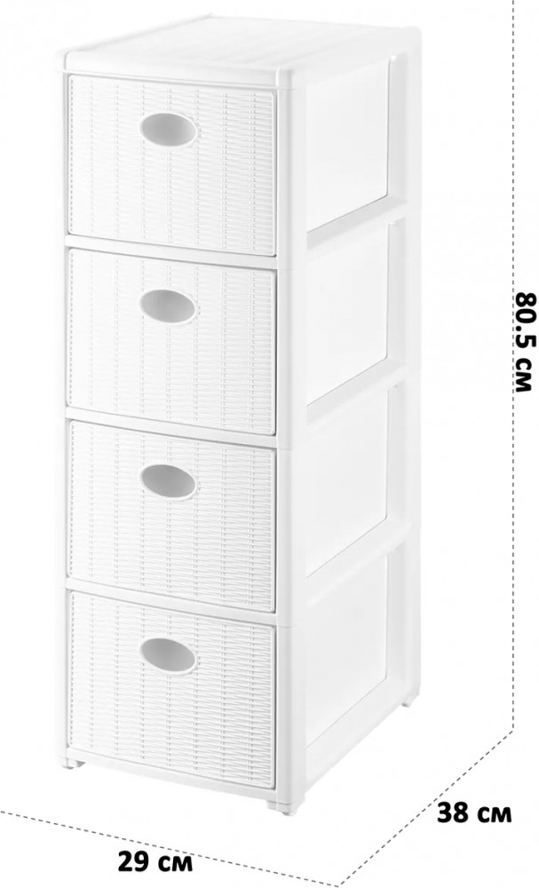 Четырёхсекционный комод 29×38×80 см от El Casa поможет с организацией хранения в вашем доме. Четыре ножки высотой 2 см оснащены колёсиками. Комод можно использовать без ножек с колёсами, тогда его высота будет 78,5 см. Внутренний размер каждого ящика по верху — 23×33×17 см, по дну — 23×36 см. Выполнен из полипропилена — прочного пластика, который не содержит бисфенол А и другие вредные вещества. За счёт своей экологичности комод подходит для хранения посуды, овощей и фруктов, а также любых других продуктов. Пластиковый шкаф с рельефным узором — это практичное решение для хранения любых вещей! Компактный, но вместительный комодик подойдёт для одежды, косметики и документов.