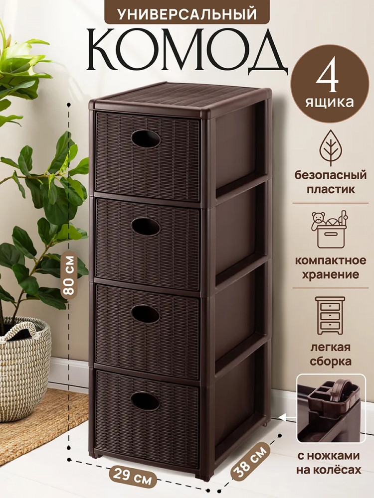Благодаря стильному дизайну он украсит интерьер спальни, ванной, кухни или прихожей. Конструкция состоит из четырёх выдвижных ящиков, помогающих эффективно организовывать пространство. Напольная модель устойчива, а благодаря лёгкому весу и колёсикам её удобно перемещать. Шкаф позволит создать дополнительное пространство для хранения обуви и аксессуаров в коридоре, гардеробной и даже на балконе. Подходит для хранения белья и детских игрушек. Послужит прикроватным органайзером в спальне и поможет хранить продукты на кухне. Такой шкафчик пригодится не только дома, но и на даче. Он подойдёт для хранения инструментов, хозяйственного инвентаря и предметов для рукоделия. Универсальный комод поможет вам поддерживать порядок в офисе, компактно хранить канцелярию, бумагу и документы.