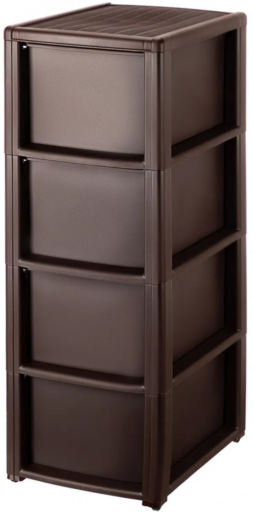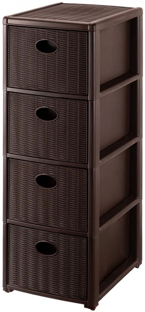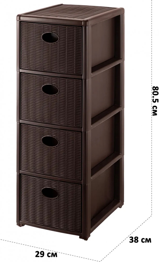 Четырёхсекционный комод 29×38×80 см от El Casa поможет с организацией хранения в вашем доме. Четыре ножки высотой 2 см оснащены колёсиками. Комод можно использовать без ножек с колёсами, тогда его высота будет 78,5 см. Внутренний размер каждого ящика по верху — 23×33×17 см, по дну — 23×36 см. Выполнен из полипропилена — прочного пластика, который не содержит бисфенол А и другие вредные вещества. За счёт своей экологичности комод подходит для хранения посуды, овощей и фруктов, а также любых других продуктов. Пластиковый шкаф с рельефным узором — это практичное решение для хранения любых вещей! Компактный, но вместительный комодик подойдёт для одежды, косметики и документов.