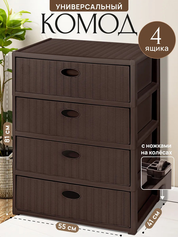 Благодаря стильному дизайну он украсит интерьер спальни, ванной, кухни или прихожей. Конструкция состоит из четырёх выдвижных ящиков, помогающих эффективно организовывать пространство. Напольная модель устойчива, а благодаря лёгкому весу и колёсикам её удобно перемещать. Шкаф позволит создать дополнительное пространство для хранения обуви и аксессуаров в коридоре, гардеробной и даже на балконе. Подходит для хранения белья и детских игрушек. Послужит прикроватным органайзером в спальне и поможет хранить продукты на кухне. Такой шкафчик пригодится не только дома, но и на даче. Он подойдёт для хранения инструментов, хозяйственного инвентаря и предметов для рукоделия. Универсальный комод поможет вам поддерживать порядок в офисе, компактно хранить канцелярию, бумагу и документы.