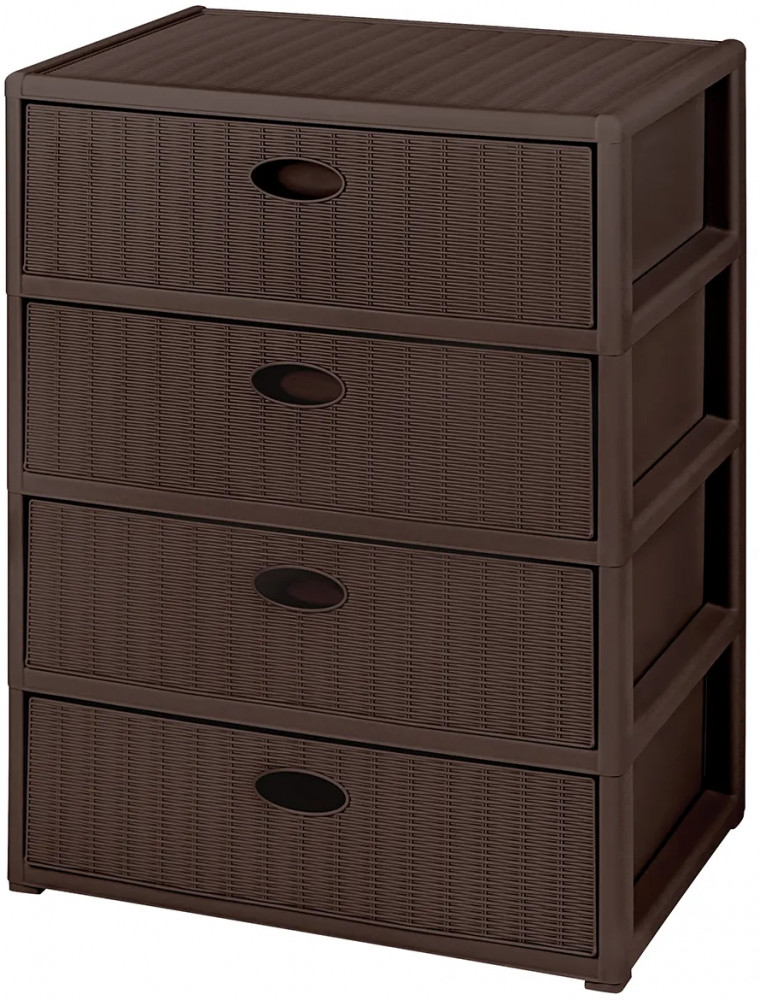 Четырёхсекционный комод от El Casa поможет с организацией хранения в вашем доме. Размер изделия — 55×41×81 см. Внутренний размер ящика по верху — 49,5×35×16 см, по дну — 48,5×34 см. Высота комода без ножек — 78,5 см. Выполнен из полипропилена — прочного пластика, который не содержит бисфенол А и другие вредные вещества. За счёт своей экологичности комод подходит для хранения посуды, овощей и фруктов, а также любых других продуктов. Пластиковый шкаф с рельефным узором — это практичное решение для хранения любых вещей! Компактный, но вместительный комодик подойдёт для одежды, косметики и документов.