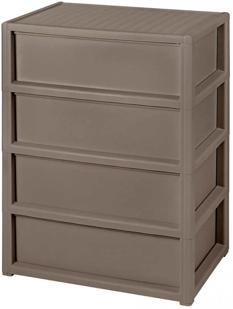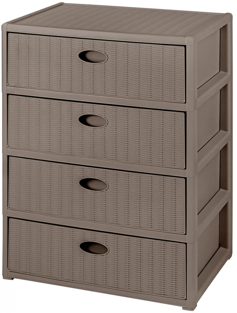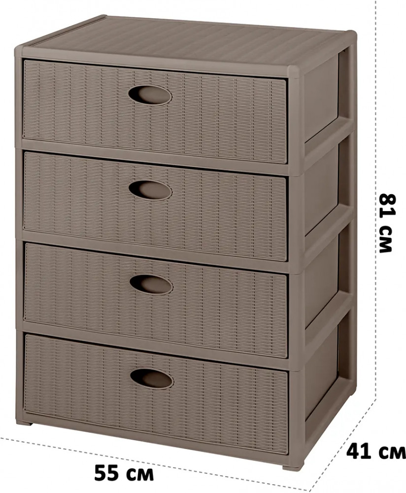Четырёхсекционный комод от El Casa поможет с организацией хранения в вашем доме. Размер изделия — 55×41×81 см. Внутренний размер ящика по верху — 49,5×35×16 см, по дну — 48,5×34 см. Высота комода без ножек — 78,5 см. Выполнен из полипропилена — прочного пластика, который не содержит бисфенол А и другие вредные вещества. За счёт своей экологичности комод подходит для хранения посуды, овощей и фруктов, а также любых других продуктов. Пластиковый шкаф с рельефным узором — это практичное решение для хранения любых вещей! Компактный, но вместительный комодик подойдёт для одежды, косметики и документов.