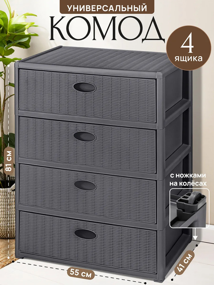 Благодаря стильному дизайну он украсит интерьер спальни, ванной, кухни или прихожей. Конструкция состоит из четырёх выдвижных ящиков, помогающих эффективно организовывать пространство. Напольная модель устойчива, а благодаря лёгкому весу и колёсикам её удобно перемещать. Шкаф позволит создать дополнительное пространство для хранения обуви и аксессуаров в коридоре, гардеробной и даже на балконе. Подходит для хранения белья и детских игрушек. Послужит прикроватным органайзером в спальне и поможет хранить продукты на кухне. Такой шкафчик пригодится не только дома, но и на даче. Он подойдёт для хранения инструментов, хозяйственного инвентаря и предметов для рукоделия. Универсальный комод поможет вам поддерживать порядок в офисе, компактно хранить канцелярию, бумагу и документы.