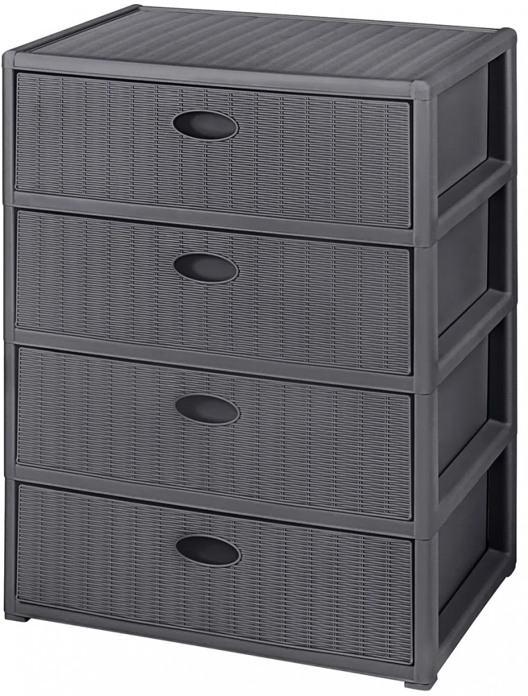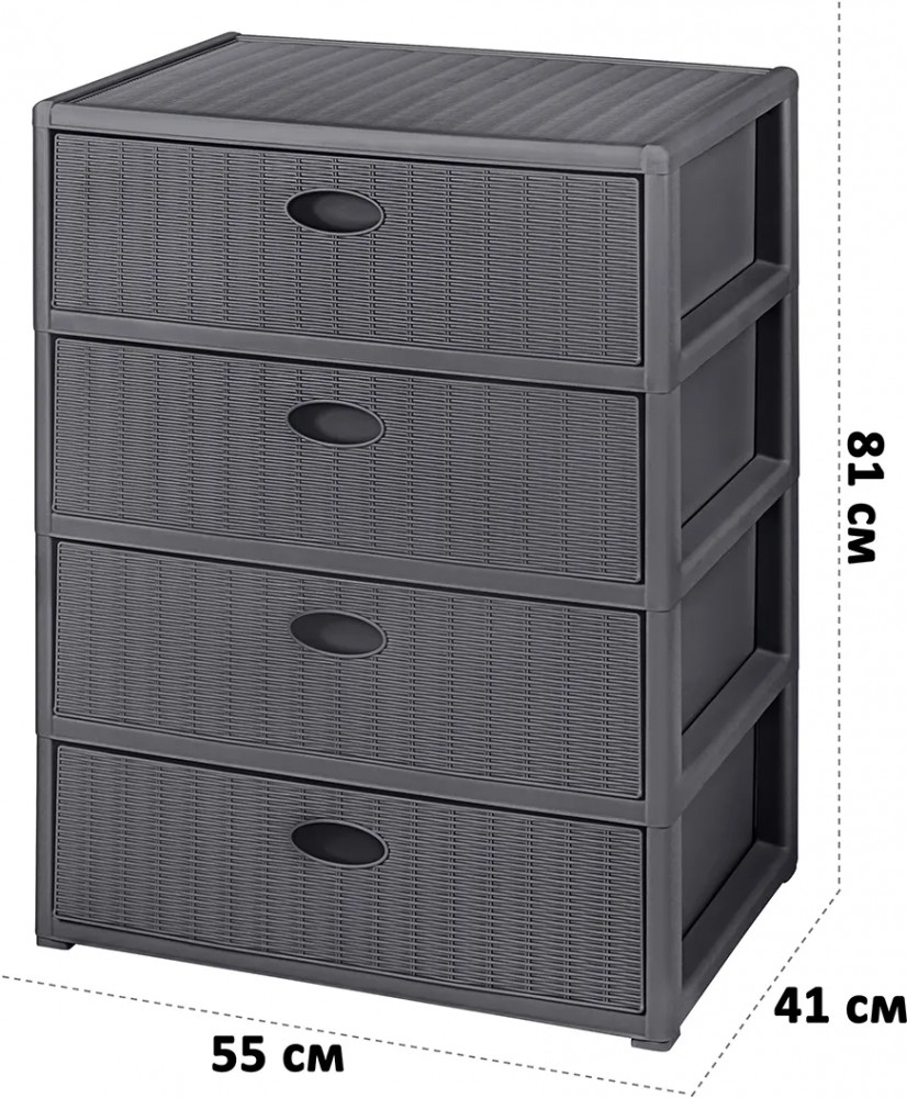 Четырёхсекционный комод от El Casa поможет с организацией хранения в вашем доме. Размер изделия — 55×41×81 см. Внутренний размер ящика по верху — 49,5×35×16 см, по дну — 48,5×34 см. Высота комода без ножек — 78,5 см. Выполнен из полипропилена — прочного пластика, который не содержит бисфенол А и другие вредные вещества. За счёт своей экологичности комод подходит для хранения посуды, овощей и фруктов, а также любых других продуктов. Пластиковый шкаф с рельефным узором — это практичное решение для хранения любых вещей! Компактный, но вместительный комодик подойдёт для одежды, косметики и документов.