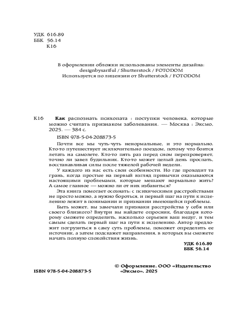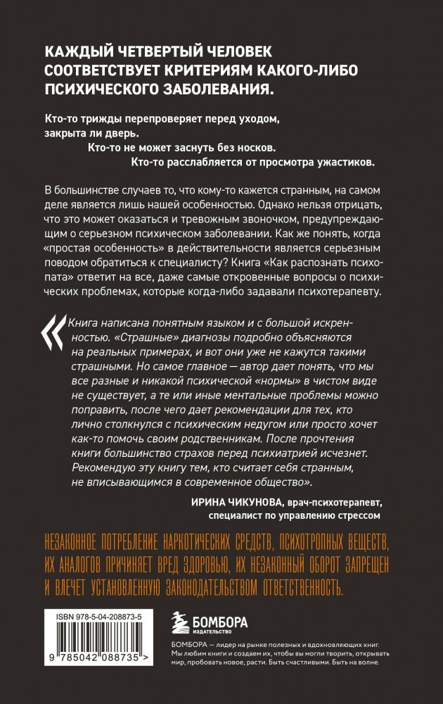 💳 Оплатить за товар можно при получении 🇰🇿 Есть бесплатная доставка по Казахстану от 1 дня 🎁 Копите бонусы с каждой покупки Серия: ТелОвидение. Внутрь тела без скальпеля и рентгена Что такое «сумасшествие» с точки зрения медицины и где та грань, когда простое беспокойство о незакрытой двери можно считать тревожностью? В чем отличие между фобией, паникой и генерализированной тревогой и как справиться с каждой из них? В чем отличие сознательных, подсознательных и бессознательных поступков? Какие фобии наиболее распространены, а самое главное — как с ними бороться? |