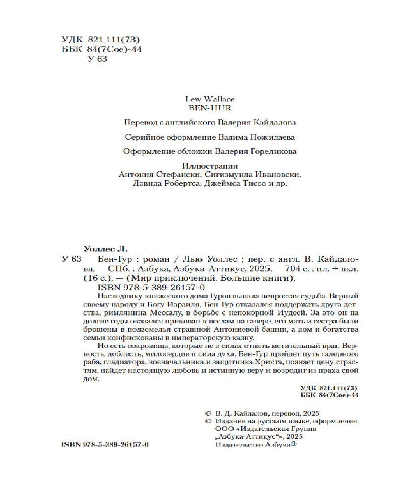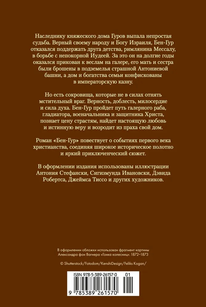 Серия: Мир приключений. Большие книги Наследнику княжеского дома Гуров выпала непростая судьба. Верный своему народу и богу Израиля, Бен-Гур отказался поддержать друга детства, римлянина Мессалу, в борьбе с непокорной Иудеей. За это он на долгие годы оказался прикован к веслам на галере, его мать и сестра были брошены в подземелья страшной Антониевой башни, а дом и богатства семьи конфискованы в императорскую казну. |