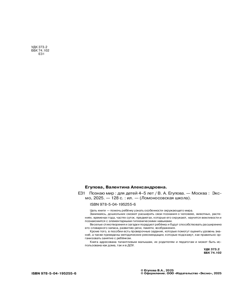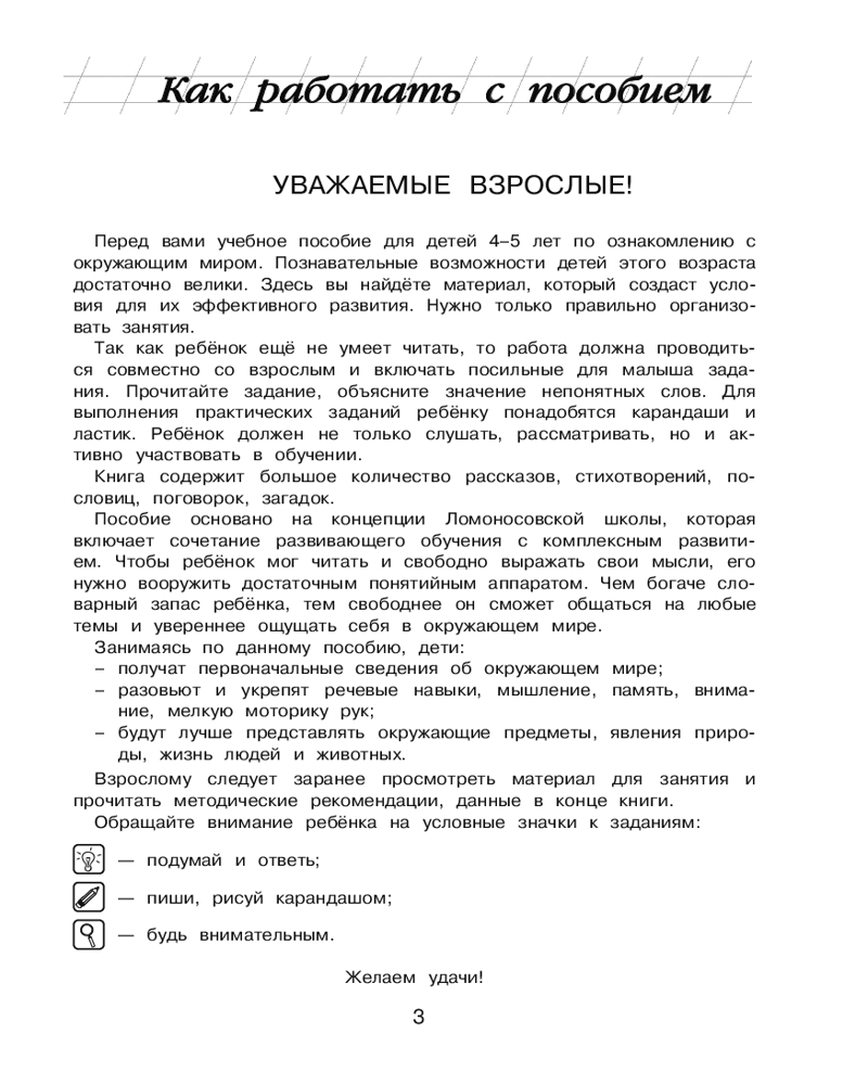 💳 Оплатить за товар можно при получении 🇰🇿 Есть бесплатная доставка по Казахстану от 1 дня 🎁 Копите бонусы с каждой покупки Серия: Ломоносовская школа (обложка, ч/б илл.) Легендарная серия обучающих пособий от «Ломоносовской школы» для развития ребенка и подготовки к школе теперь в черно-белом оформлении! Проверенная на практике и показавшая свою эффективность методика, умело сочетающая современные технологии обучения с лучшими классическими традициями российского образования, поможет взрослым дать дошкольнику начальные сведения об окружающем его мире (предметах, живой и неживой природе, человеке), расширить его кругозор и словарный запас. Выполняя интересные игровые задания, ребенок узнает много нового о домашних и диких животных, рыбах и птицах, цветах и деревьях, временах года и частях суток, одежде и головных уборах, транспорте, посуде, научится применять вежливые слова, закрепит знания о правилах личной гигиены. Книга содержит большое количество стихотворений и загадок, благодаря чему ребенок будет познавать этот мир весело и интересно. Кроме того, в пособии имеются проверочные задания, чтобы родители смогли быстро оценить уровень знаний дошкольника, а также приведены методические рекомендации, которые подскажут, как правильно организовать занятие с ребенком. |