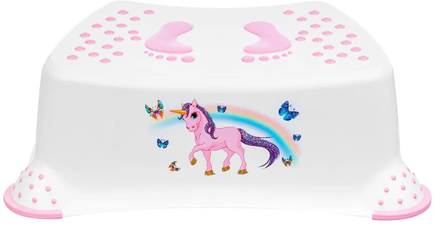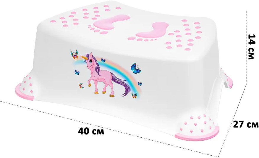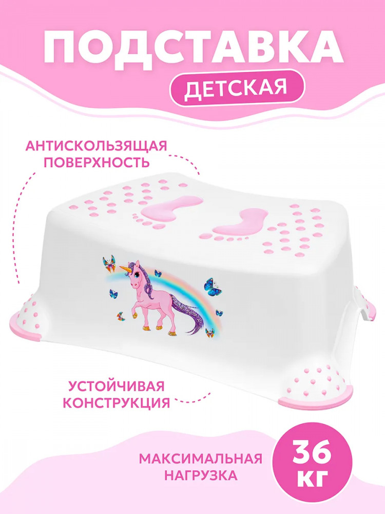 Подставка оборудована устойчивыми прорезиненными ножками и рельефной поверхностью, поэтому она не скользит по полу, а ребёнку будет комфортно и удобно стоять на ней. Изделие имеет сглаженную форму без острых углов. Подставка бело-розового цвета дополнена забавным рисунком с радугой, единорогом и бабочками. Она обязательно привлечёт внимание ребёнка и гармонично впишется в любой интерьер. Лёгкую подставку ребёнок сможет сам перемещать из одной комнаты в другую. Не рекомендуется применять абразивные моющие средства. Подставка от бренда El Casa станет практичным и красивым интерьерным решением и незаменимым элементом вашего домашнего инвентаря.