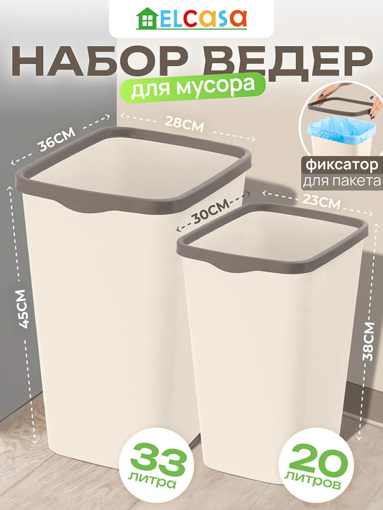 Набор 2 вёдер для мусора от бренда El Casa поможет поддерживать чистоту в вашем доме, офисе или на улице. Каждое мусорное ведро прямоугольной формы выполнено из полипропилена. Этот вид пластика считается наиболее безопасным, так как не содержит бисфенол А и не выделяет вредных веществ. Дизайн представляет собой стильное сочетание белого и серого цветов.