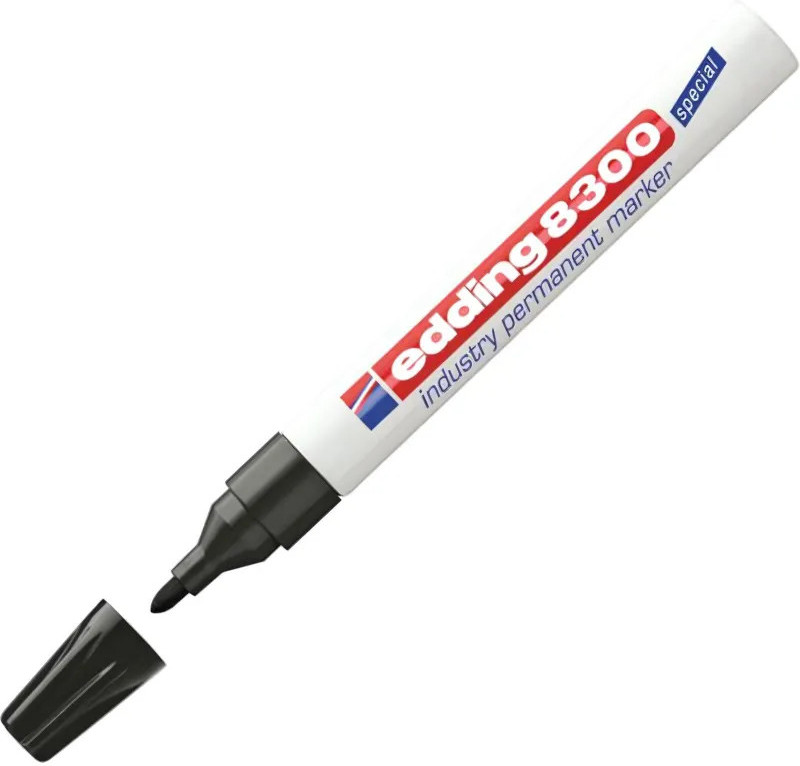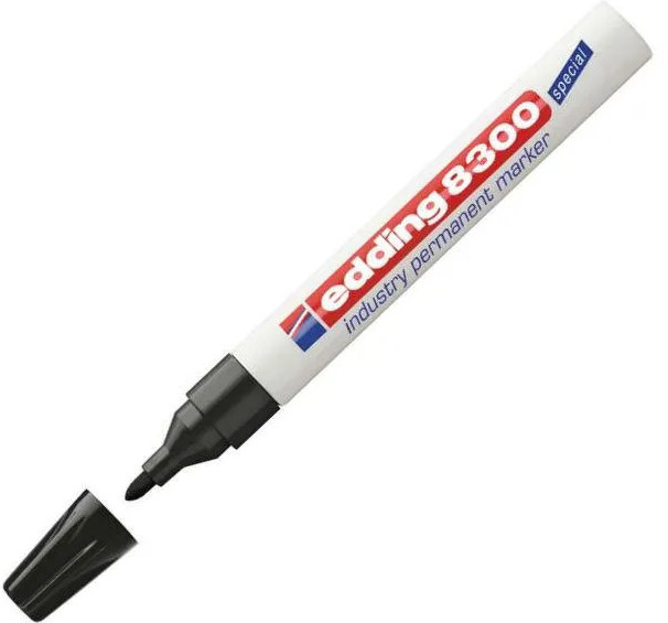 Маркер для агрессивной среды Edding E-8300 — разрабатывался как промышленный перманентный маркер для маркировки на жирной и пыльной поверхности. Маркер Edding E 8300 представляет собой отличное решение для маркировки вне помещения — там, где поверхность подвержена воздействию влаги и пыли. Маркер широко используется в нефтегазовом секторе, в металлопрокате и при изготовлении металлоконструкций, автомобильной промышленности, а также в климатических условиях с повышенной влажностью. Корпус маркера изготовлен из алюминия, пишущий узел промышленного маркера обладает дополнительно усиленным круглым пулевидным наконечником, устойчивым к истиранию. Чернила отличаются повышенной концентрацией пигментов, а так же в состав входят дополнительные компоненты, растворяющие масляную пленку при написании по поверхности. Чернила перманентные, светостойкие, водостойкие, устойчивы к кислотам и растворителям. Размеры маркера: диаметр 15 мм, длина 141 мм.