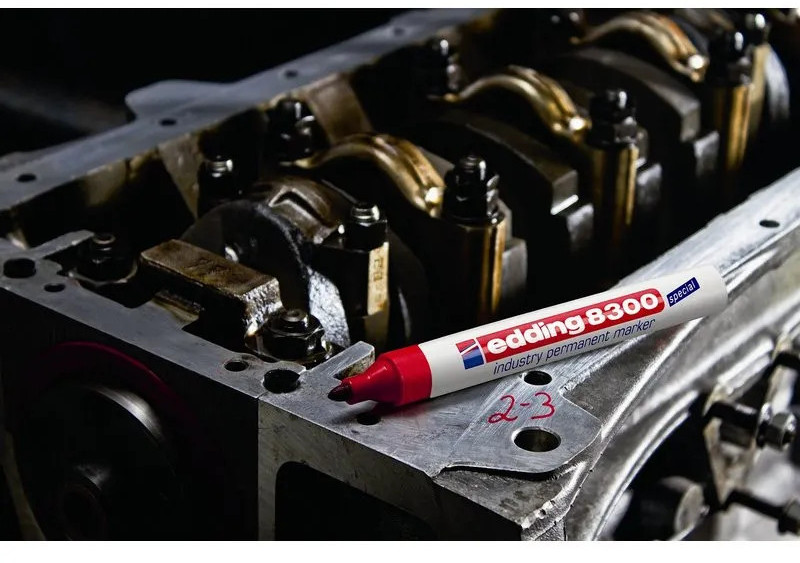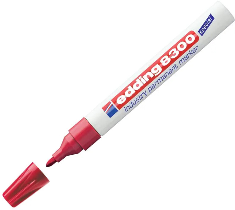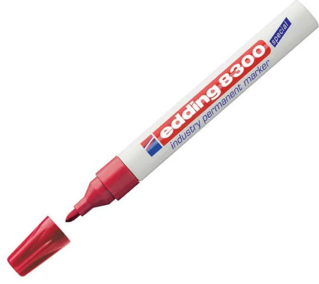 Маркер для агрессивной среды Edding E-8300 — разрабатывался как промышленный перманентный маркер для маркировки на жирной и пыльной поверхности. Маркер Edding E 8300 представляет собой отличное решение для маркировки вне помещения — там, где поверхность подвержена воздействию влаги и пыли. Маркер широко используется в нефтегазовом секторе, в металлопрокате и при изготовлении металлоконструкций, автомобильной промышленности, а также в климатических условиях с повышенной влажностью. Корпус маркера изготовлен из алюминия, пишущий узел промышленного маркера обладает дополнительно усиленным круглым пулевидным наконечником, устойчивым к истиранию. Чернила отличаются повышенной концентрацией пигментов, а так же в состав входят дополнительные компоненты, растворяющие масляную пленку при написании по поверхности. Чернила перманентные, светостойкие, водостойкие, устойчивы к кислотам и растворителям. Размеры маркера: диаметр 15 мм, длина 141 мм.