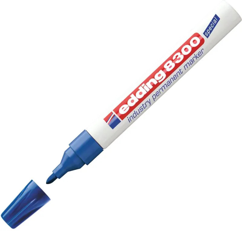 Маркер для агрессивной среды Edding E-8300 — разрабатывался как промышленный перманентный маркер для маркировки на жирной и пыльной поверхности. Маркер Edding E 8300 представляет собой отличное решение для маркировки вне помещения — там, где поверхность подвержена воздействию влаги и пыли. Маркер широко используется в нефтегазовом секторе, в металлопрокате и при изготовлении металлоконструкций, автомобильной промышленности, а также в климатических условиях с повышенной влажностью. Корпус маркера изготовлен из алюминия, пишущий узел промышленного маркера обладает дополнительно усиленным круглым пулевидным наконечником, устойчивым к истиранию. Чернила отличаются повышенной концентрацией пигментов, а так же в состав входят дополнительные компоненты, растворяющие масляную пленку при написании по поверхности. Чернила перманентные, светостойкие, водостойкие, устойчивы к кислотам и растворителям. Размеры маркера: диаметр 15 мм, длина 141 мм.