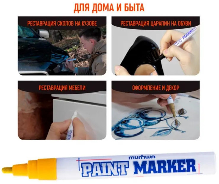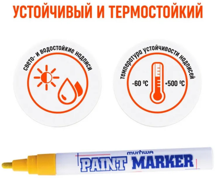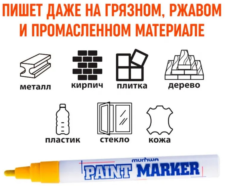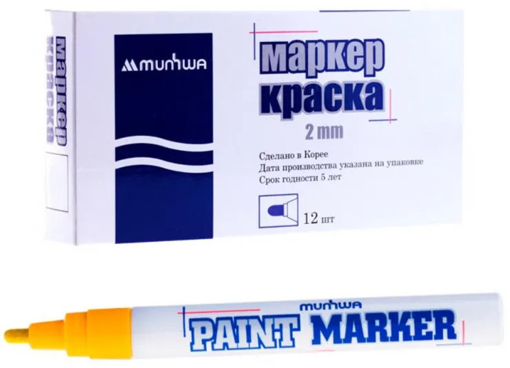 Маркер-краска MunHwa — профессиональный лаковый маркер на нитрооснове. Paint Marker MunHwa пишет на всех типах поверхностей: металл, дерево, резина, бетон, стекло, кожа. Размеры маркера: диаметр 15 мм, длина 144 мм. Paint Marker подходит для реставрации дефектов на бытовой технике, обуви, кузове автомобиля, а также надписей на каменных плитах. Маркер-краска MunHwa имеет широкое применения в дизайне, декорировании и оформлении. Корпус маркера изготовлен из прочного алюминия. Клапанный механизм пишущего узла исключает растекание и разбрызгивание краски, преждевременное пересыхание маркера, срок годности 5 лет. Благодаря высококачественным чернилам, краска ложиться на поверхность равномерным и однородным слоем, полностью закрашивая обрабатываемую поверхность, быстро сохнет. После высыхания, надписи обладают свето- и водостойкостью, термостойкостью, устойчивостью к механическим воздействиям.