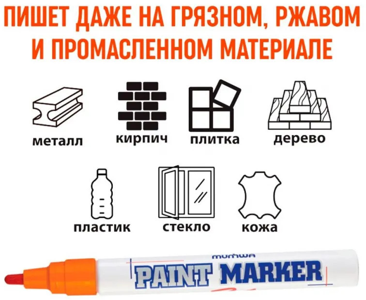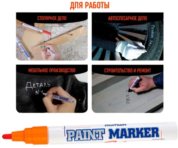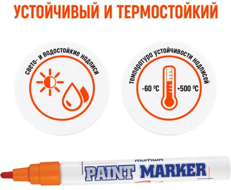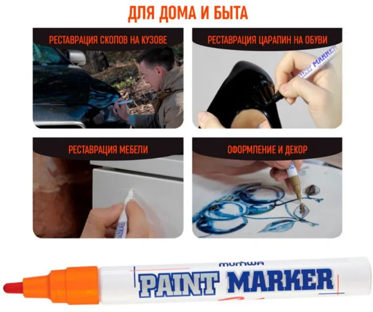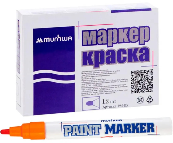 Маркер-краска MunHwa — профессиональный лаковый маркер на нитрооснове. Paint Marker MunHwa пишет на всех типах поверхностей: металл, дерево, резина, бетон, стекло, кожа. Размеры маркера: диаметр 15 мм, длина 144 мм. Paint Marker подходит для реставрации дефектов на бытовой технике, обуви, кузове автомобиля, а также надписей на каменных плитах. Маркер-краска MunHwa имеет широкое применения в дизайне, декорировании и оформлении. Корпус маркера изготовлен из прочного алюминия. Клапанный механизм пишущего узла исключает растекание и разбрызгивание краски, преждевременное пересыхание маркера, срок годности 5 лет. Благодаря высококачественным чернилам, краска ложиться на поверхность равномерным и однородным слоем, полностью закрашивая обрабатываемую поверхность, быстро сохнет. После высыхания, надписи обладают свето- и водостойкостью, термостойкостью, устойчивостью к механическим воздействиям.