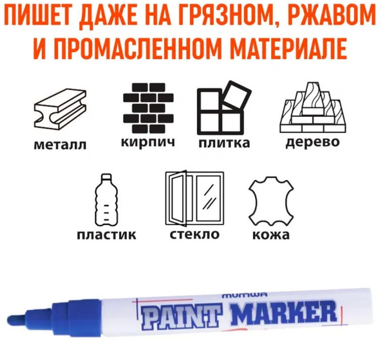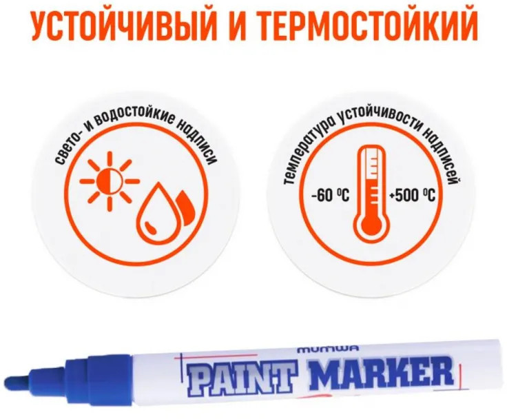 Маркер-краска MunHwa — профессиональный лаковый маркер на нитрооснове. Paint Marker MunHwa пишет на всех типах поверхностей: металл, дерево, резина, бетон, стекло, кожа. Размеры маркера: диаметр 15 мм, длина 144 мм. Paint Marker подходит для реставрации дефектов на бытовой технике, обуви, кузове автомобиля, а также надписей на каменных плитах. Маркер-краска MunHwa имеет широкое применения в дизайне, декорировании и оформлении. Корпус маркера изготовлен из прочного алюминия. Клапанный механизм пишущего узла исключает растекание и разбрызгивание краски, преждевременное пересыхание маркера, срок годности 5 лет. Благодаря высококачественным чернилам, краска ложиться на поверхность равномерным и однородным слоем, полностью закрашивая обрабатываемую поверхность, быстро сохнет. После высыхания, надписи обладают свето- и водостойкостью, термостойкостью, устойчивостью к механическим воздействиям.