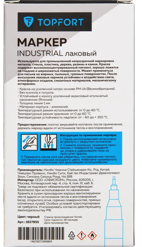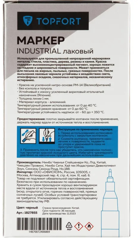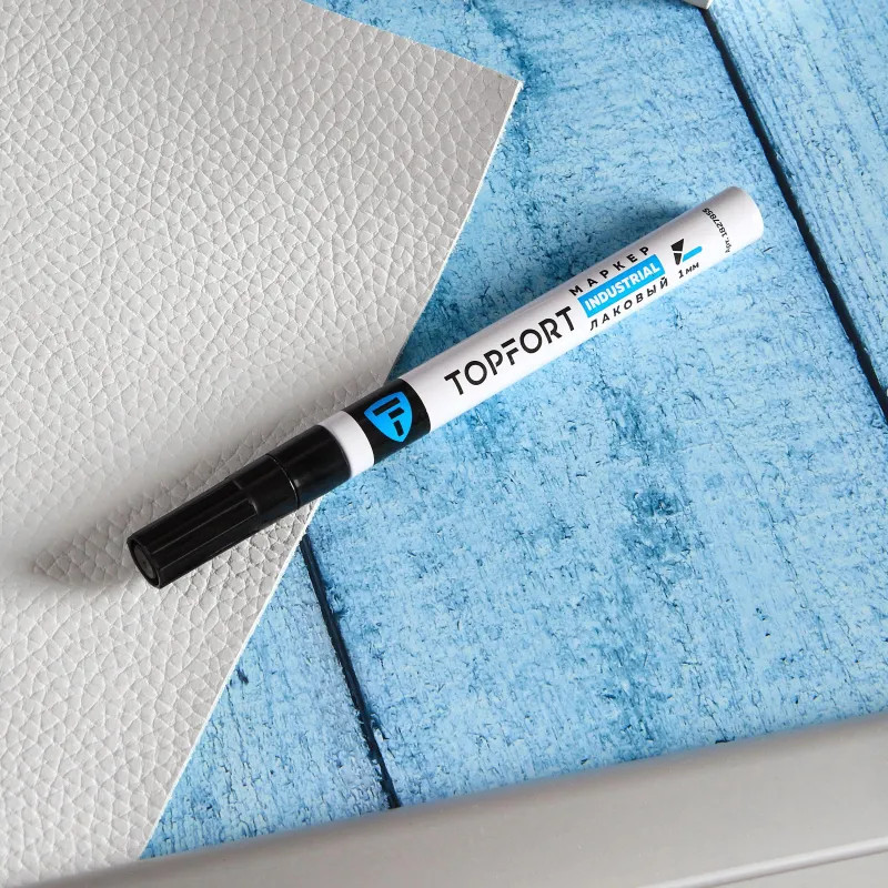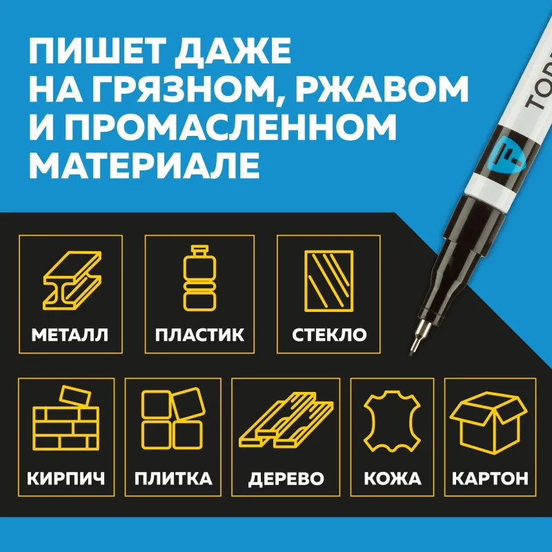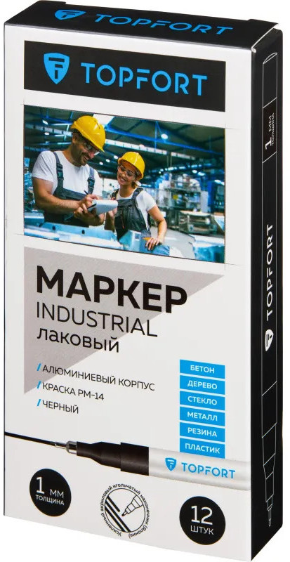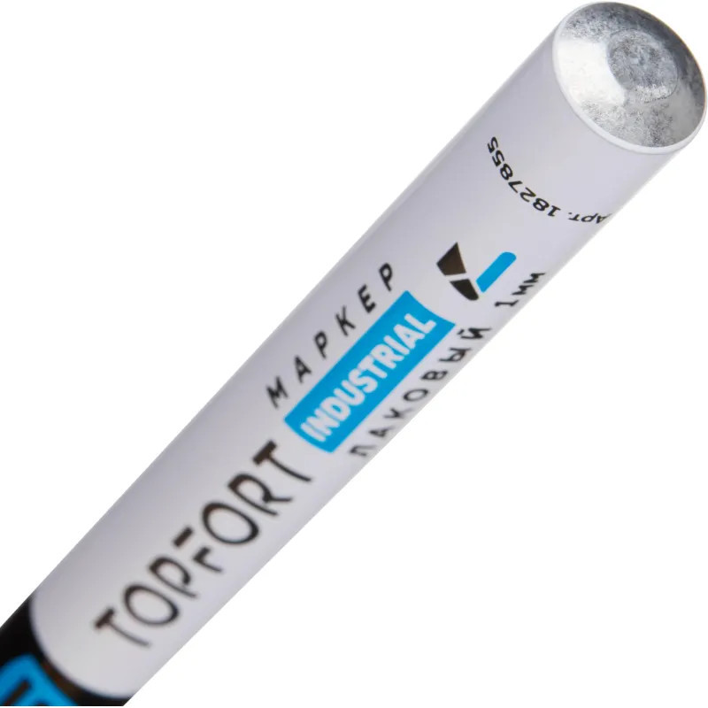 Маркер промышленный Topfort Industrial для универсальной маркировки черный (1 мм) предназначен для промышленной непрозрачной маркировки металла, стекла, пластика, дерева, резины, камня, картона, кирпича, текстиля, кожи (материал), бумаги, бетона. Краска содержит высококонцентрированный пигмент, хорошо ложится на гладкие и шероховатые поверхности. Может применяться для письма на жирных, пыльных, грязных поверхностях. После высыхания лаковые чернила устойчивы к воздействию света, атмосферных осадков, смазочных материалов, механическому истиранию. Создает стойкую линию толщиной 1 мм. Длина маркера — 132 мм. Цвет чернил: черный.
