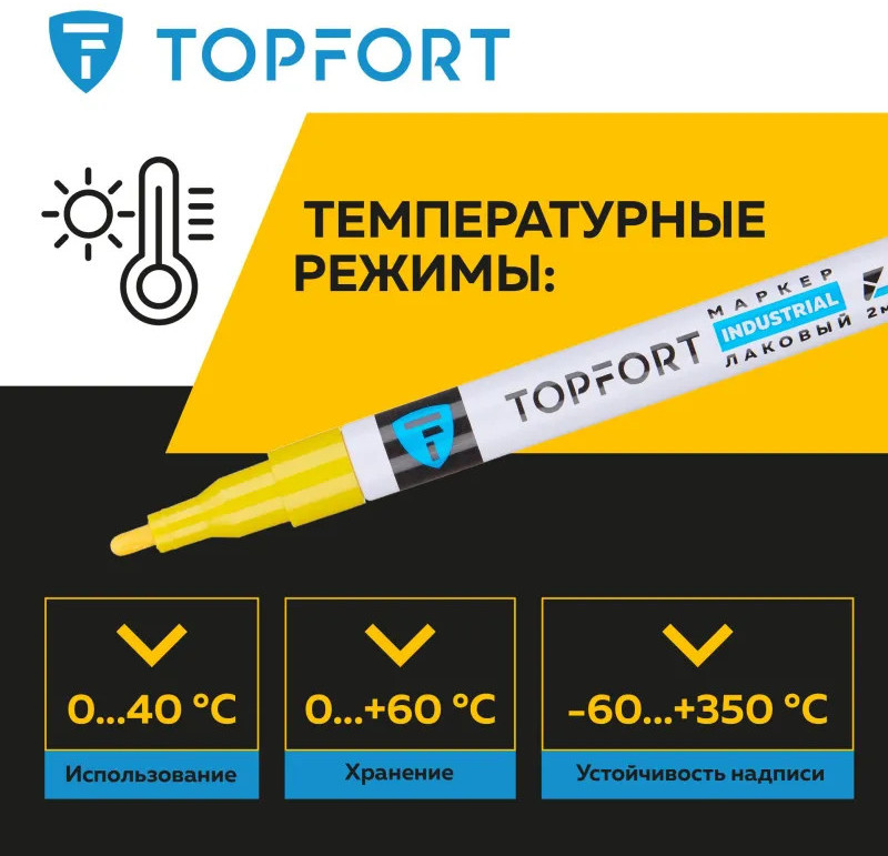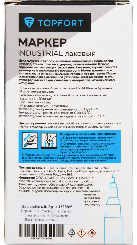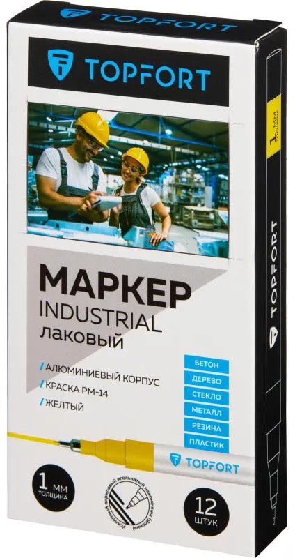 Маркер промышленный Topfort Industrial для универсальной маркировки желтый (2 мм) предназначен для промышленной непрозрачной маркировки металла, стекла, пластика, дерева, резины, камня, картона, кирпича, текстиля, кожи (материал), бумаги, бетона. Краска содержит высококонцентрированный пигмент, хорошо ложится на гладкие и шероховатые поверхности. Может применяться для письма на жирных, пыльных, грязных поверхностях. После высыхания лаковые чернила устойчивы к воздействию света, атмосферных осадков, смазочных материалов, механическому истиранию. Создает стойкую линию толщиной 2 мм. Длина маркера — 130 мм. Цвет чернил: желтый.