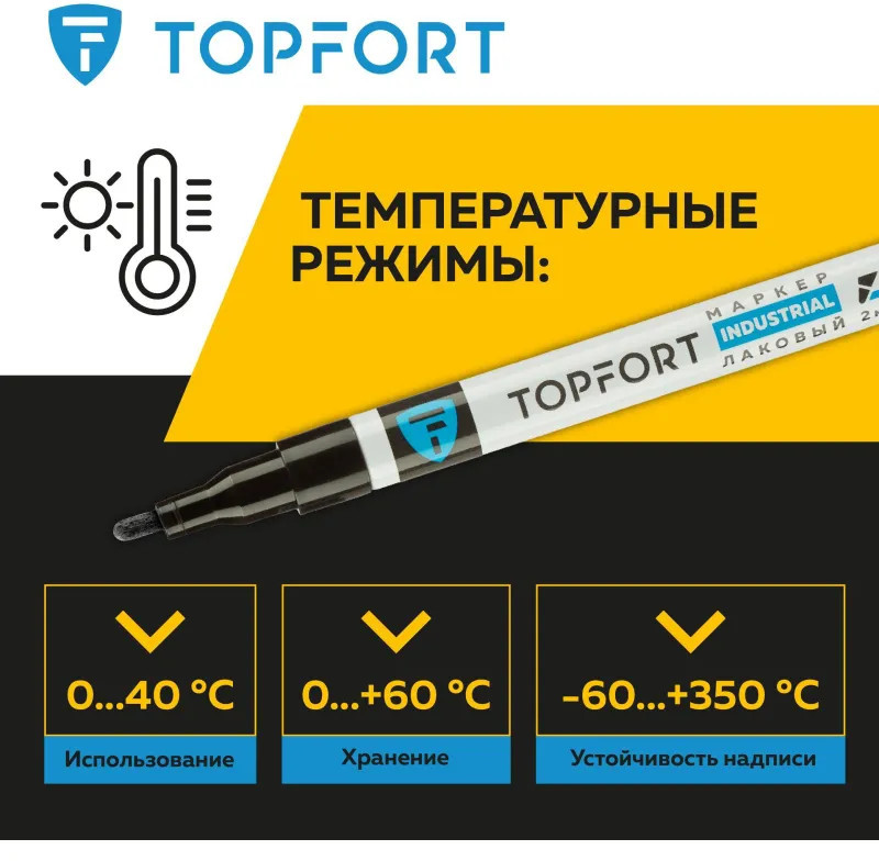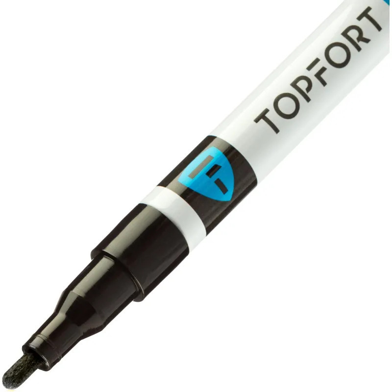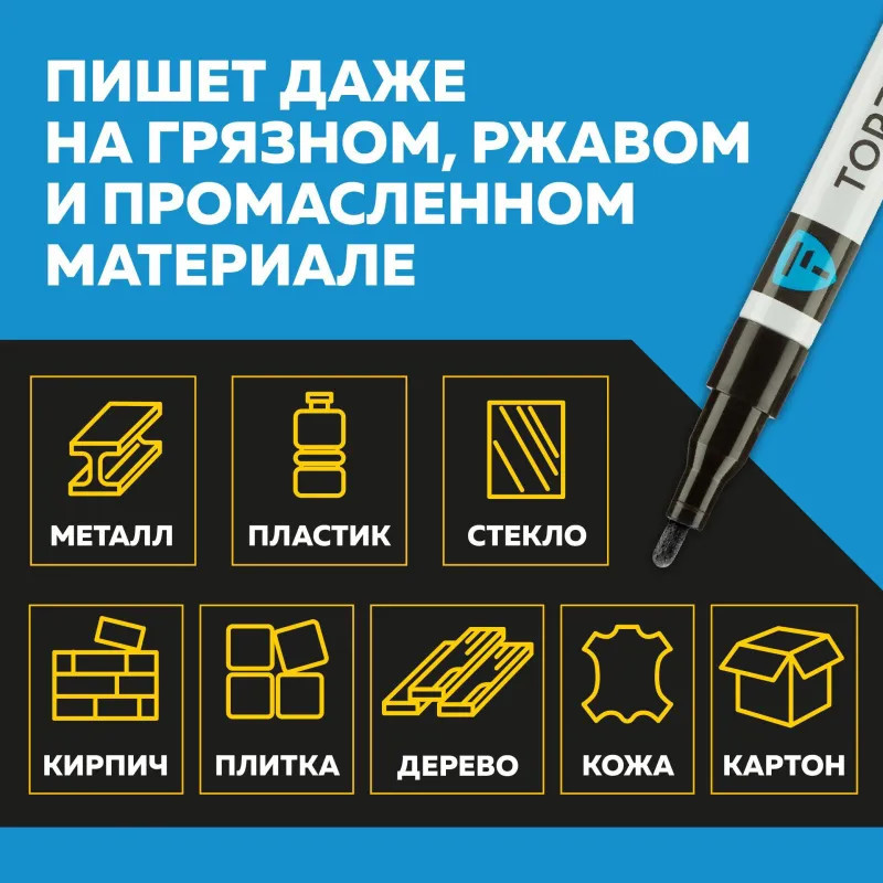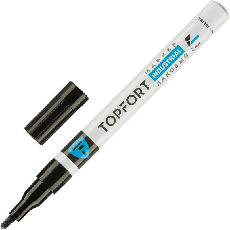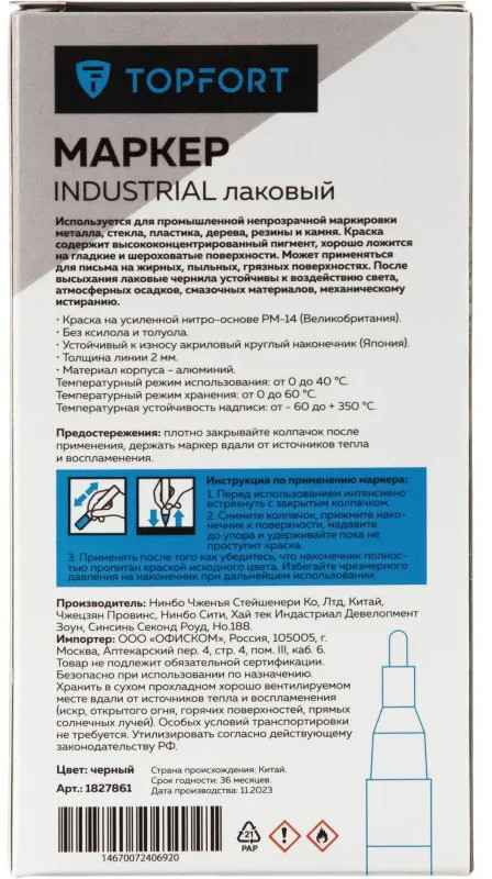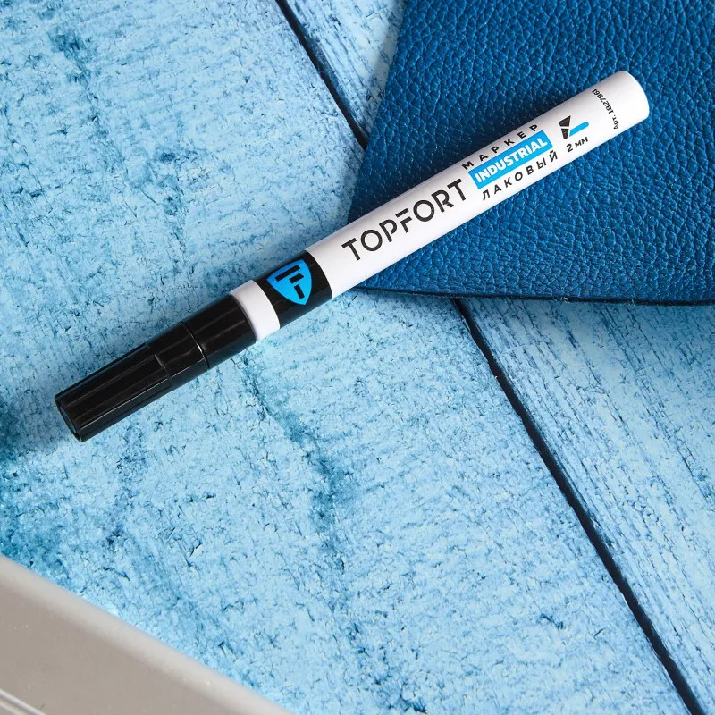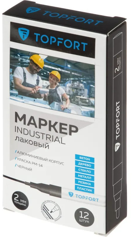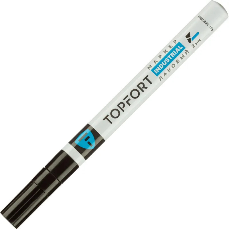 Маркер промышленный Topfort Industrial для универсальной маркировки черный (2 мм) предназначен для промышленной непрозрачной маркировки металла, стекла, пластика, дерева, резины, камня, картона, кирпича, текстиля, кожи (материал), бумаги, бетона. Краска содержит высококонцентрированный пигмент, хорошо ложится на гладкие и шероховатые поверхности. Может применяться для письма на жирных, пыльных, грязных поверхностях. После высыхания лаковые чернила устойчивы к воздействию света, атмосферных осадков, смазочных материалов, механическому истиранию. Создает стойкую линию толщиной 2 мм. Длина маркера — 130 мм. Цвет чернил: черный.